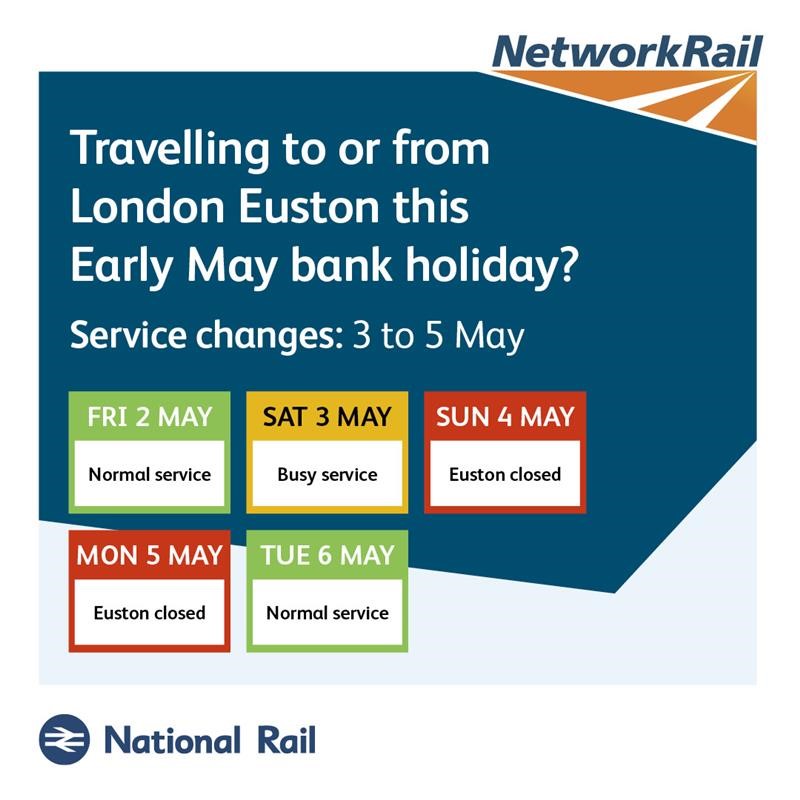 As a result, Euston station will be closed on Sunday 4 May and Monday 5 May with all trains terminating at Milton Keynes*.