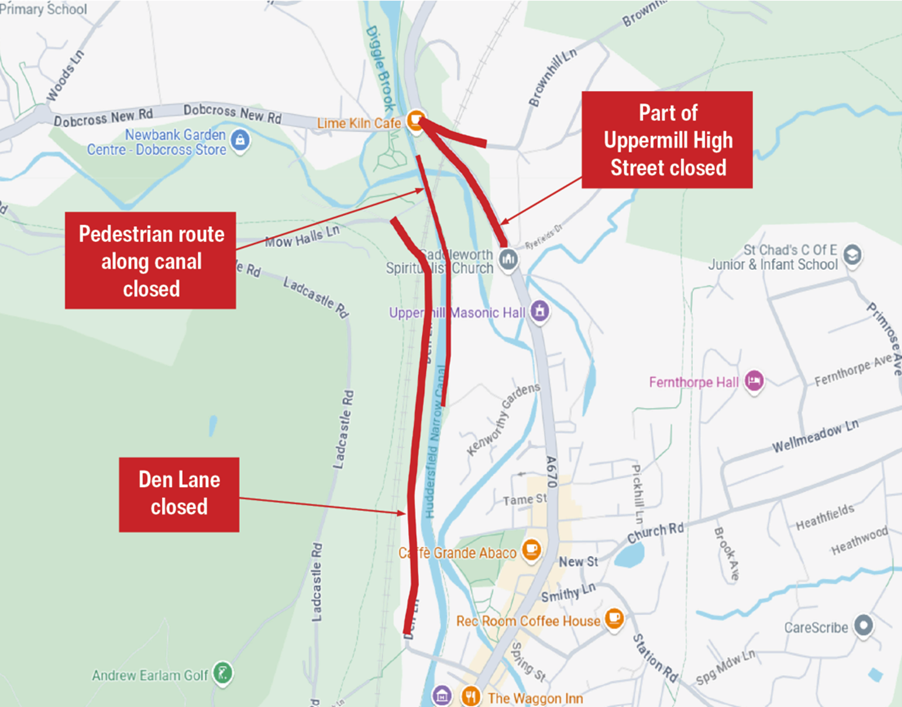 Part of Brownhill Lane, Den Lane, and the pedestrian footpath along Huddersfield Narrow Canal will also be shut on these dates and times.