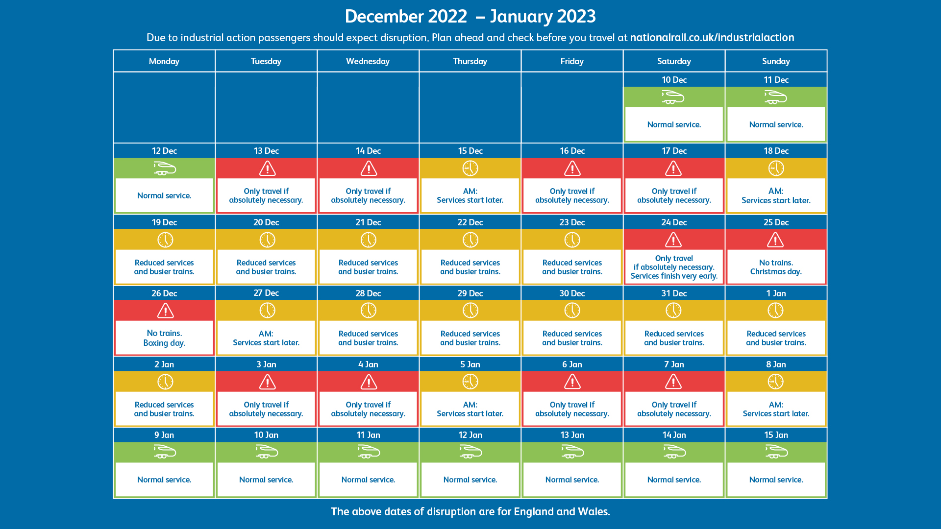 - Only absolutely necessary rail travel is advised during strike action on 13, 14, 16 and 17 December