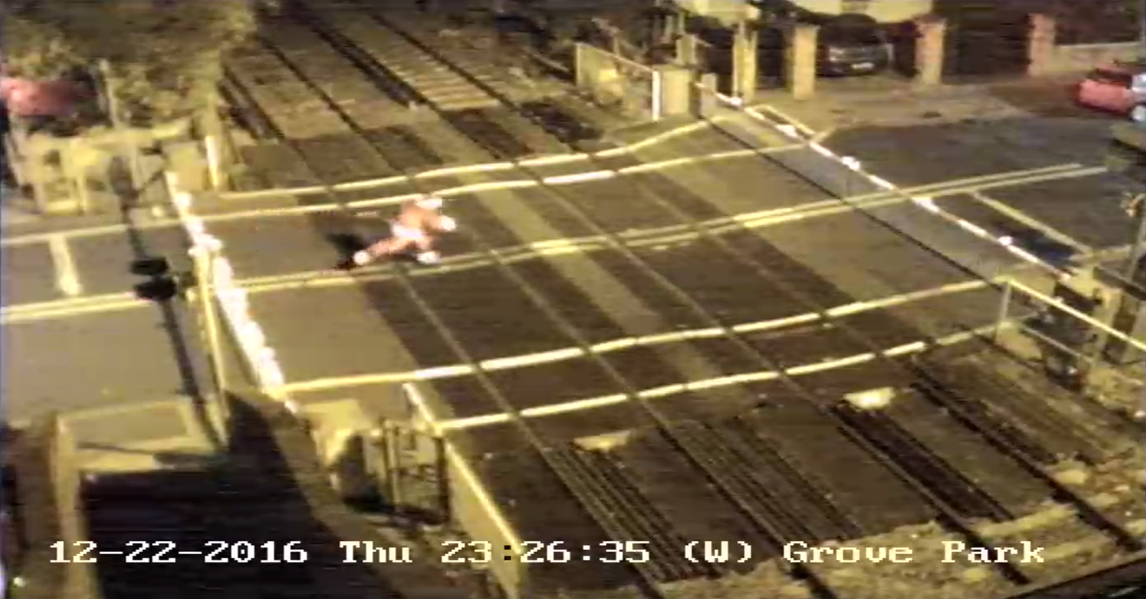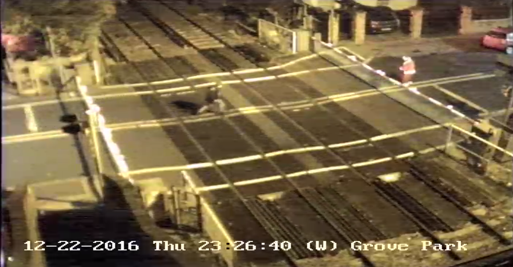 The first incident, which occurred at Grove Park level crossing on the evening of 22 December in Chiswick, west London, shows the barriers coming down while lights flash to warn that a train is approaching. However, once the barriers are down, one pedestrian pushes through the barrier to cross, followed by another shortly after.