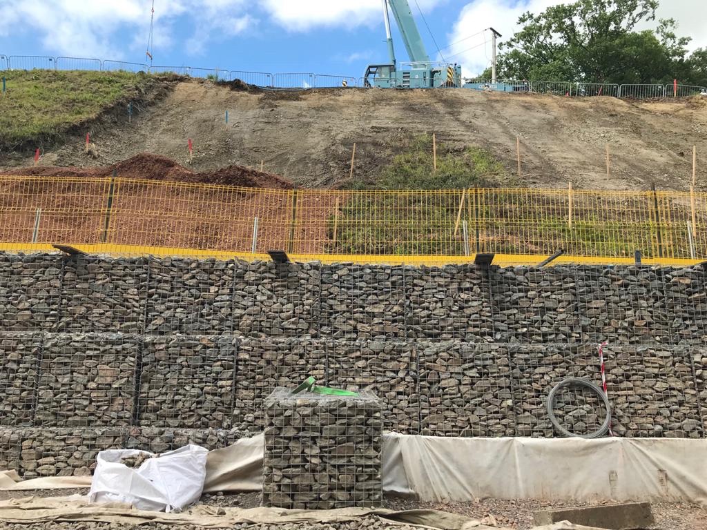 - Built a 40 metre gabion wall – wire baskets filled with stone – at the bottom of the cutting for extra protection