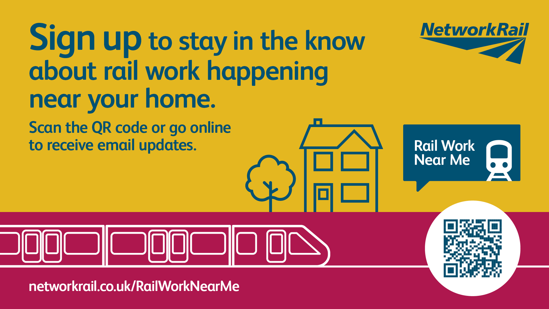 Line side neighbours living within 500m of a railway line across Network Rail’s Wessex route - which serves the towns and communities in part or all of the counties of Surrey, Berkshire, Hampshire, Dorset, Devon, Somerset and Wiltshire – are encouraged to sign up to this new email service by visiting www.networkrail.co.uk/railworknearme.
