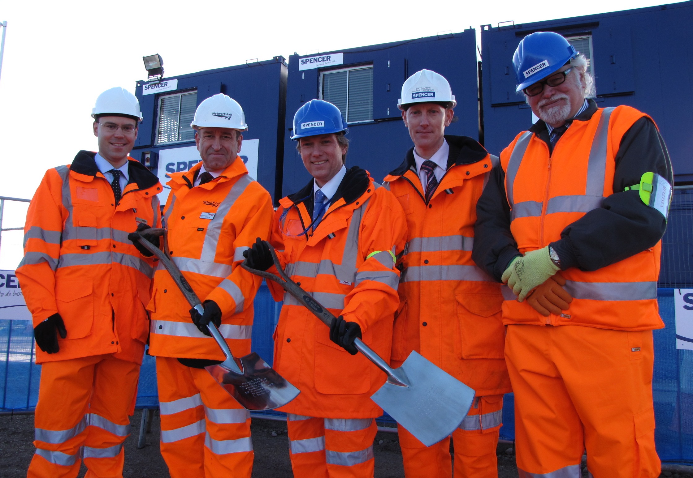 Work on the new rail operating centre at Three Bridges station was officially started by (from left): Chris Burchell, managing director of Southern trains; Mark Ruddy, Network Rail's route managing director for Sussex; Henry Smith MP for Crawley; Brett Jarman, Spencer's project director, and Peter Lawrence, Spencer's rail director (south).