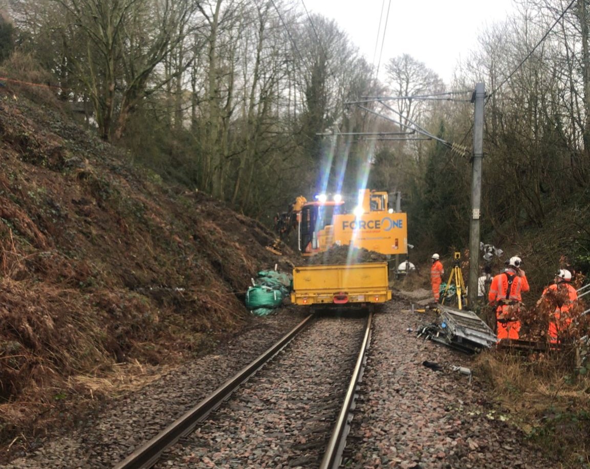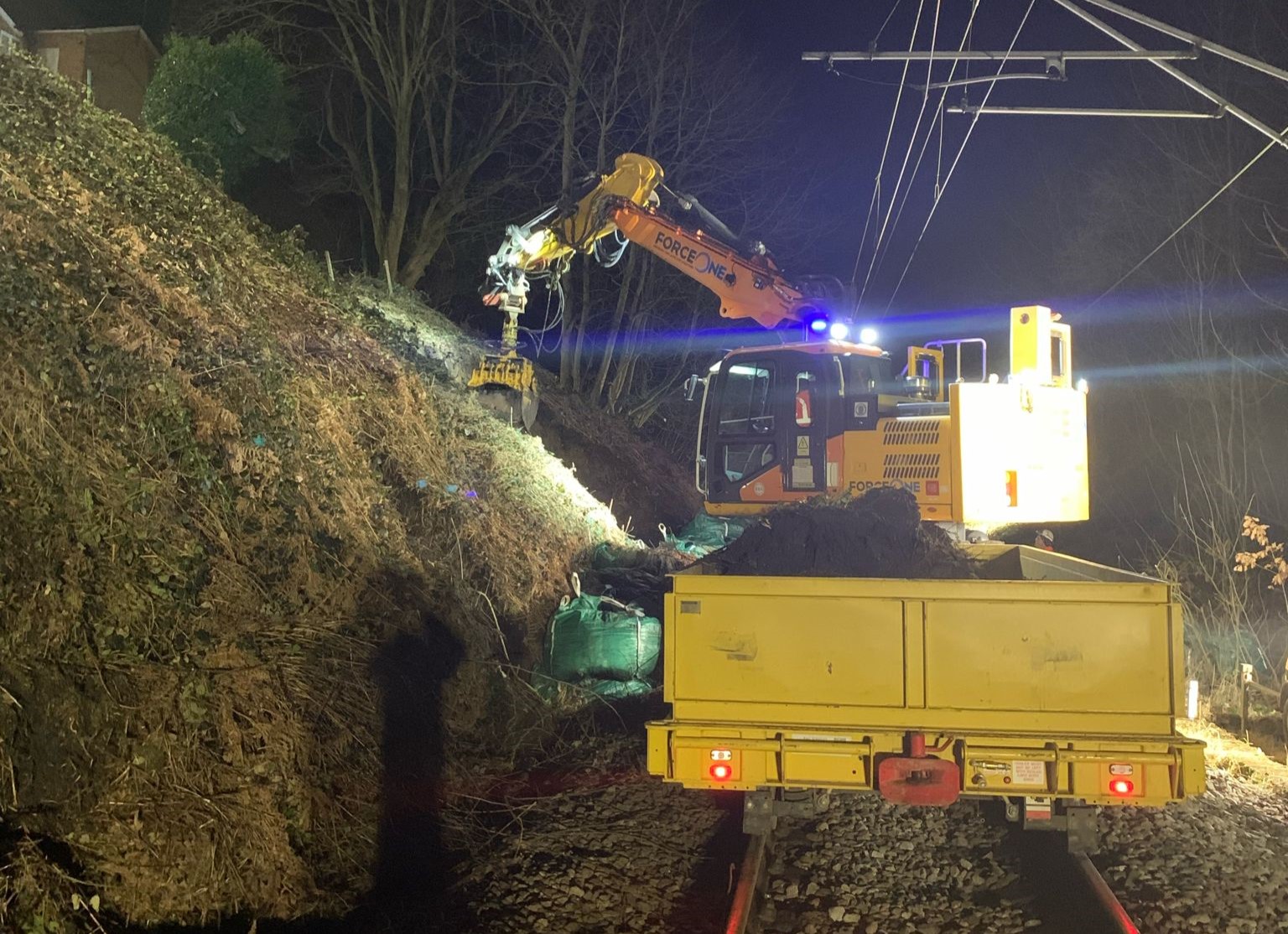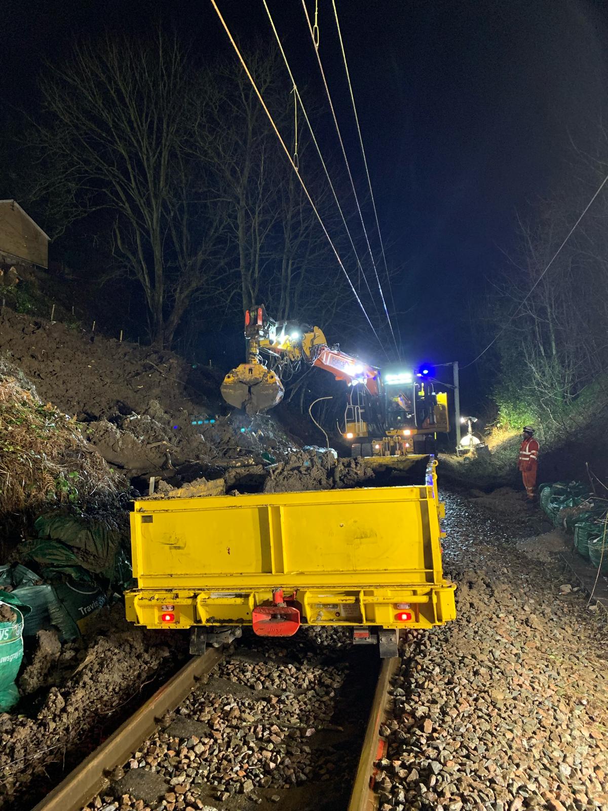 Engineers are removing more than 2,500 tonnes of soil from the slope in a bid to relieve the pressure on the land and protect the railway line below. Work is being carried out around the clock with specialist engineering trains being used on site.