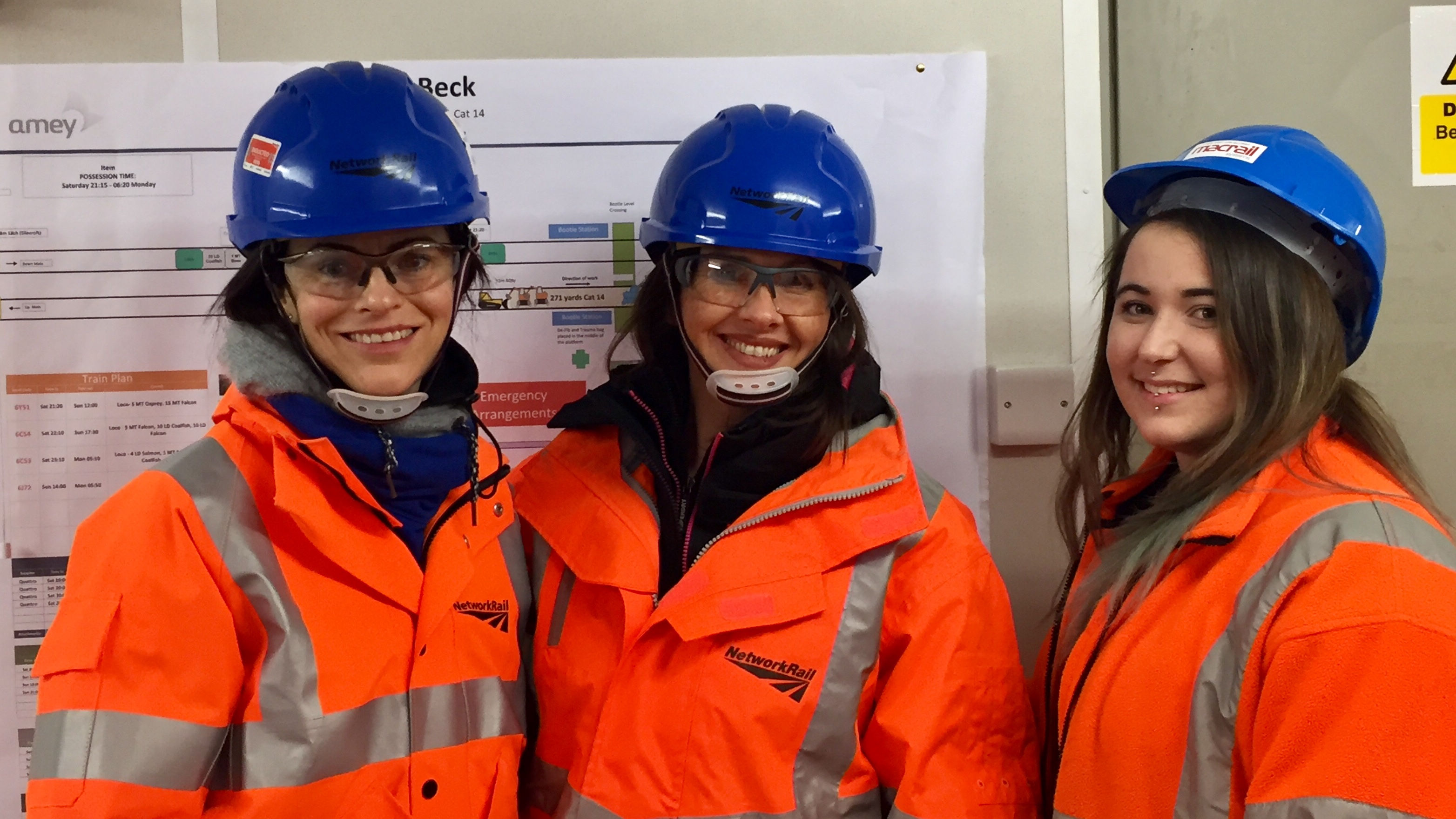 Danielle Lahan from Network Rail (L), Trudy Harrison MP (C), Sophie Quinlan, site supervisor for MacRail (R)
