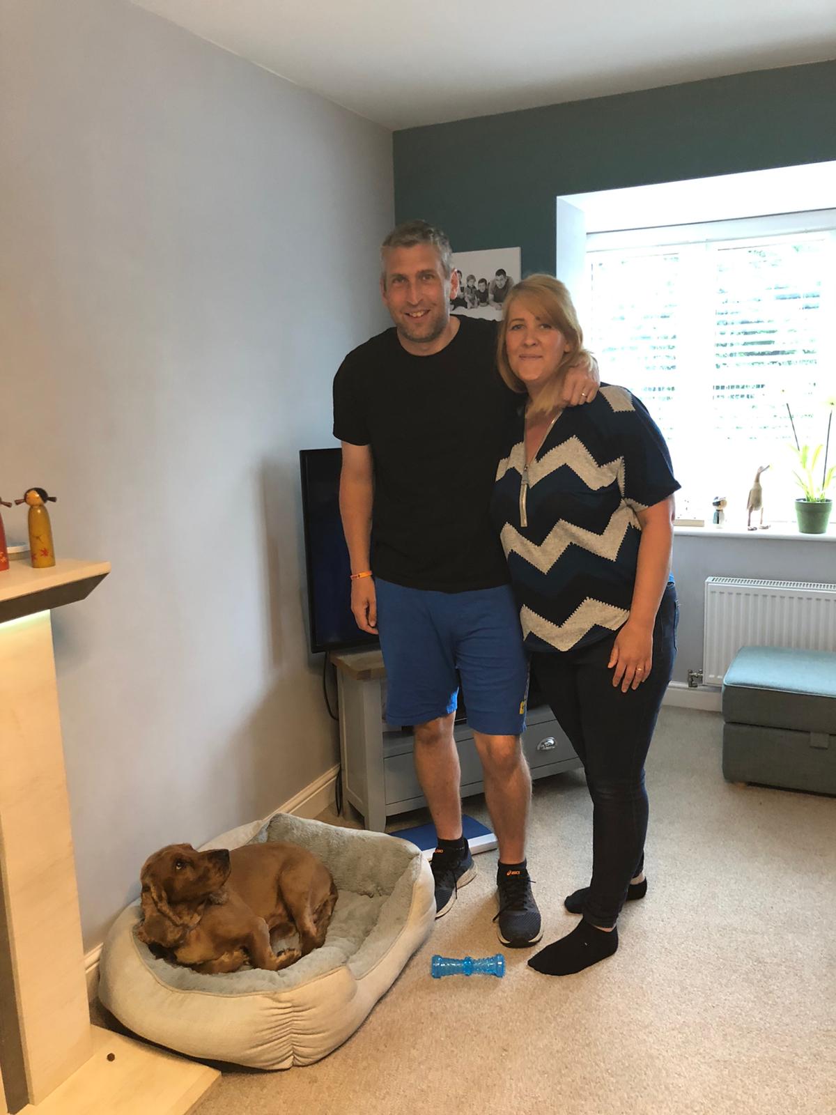 Rover back safe in his basket alongside owners Alan and Laura