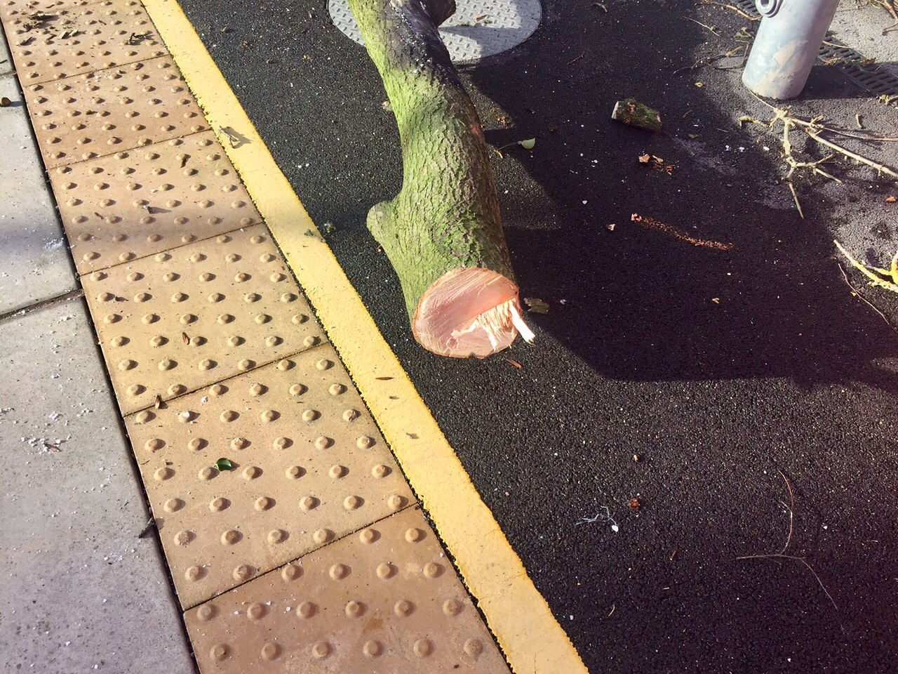 Close up showing the diameter of the branches left on the station platform at Roby