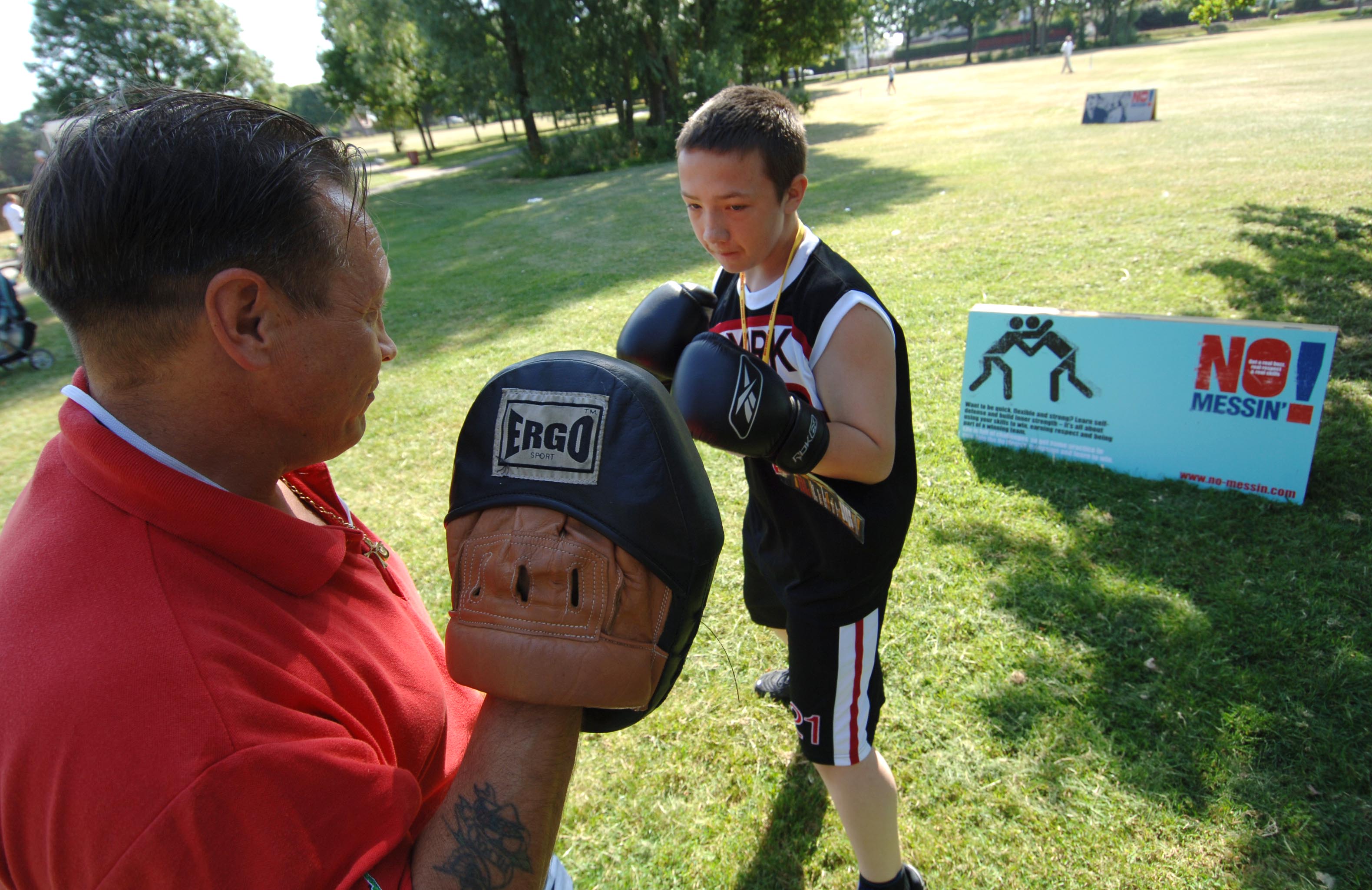 Daniel Thomas, 12 of Llanrumney, Cardiff enjoys a boxing lesson with Boxing Community Coach Alan Davis at No Messin' Live! Cardiff at the Eastern Leisure Centre