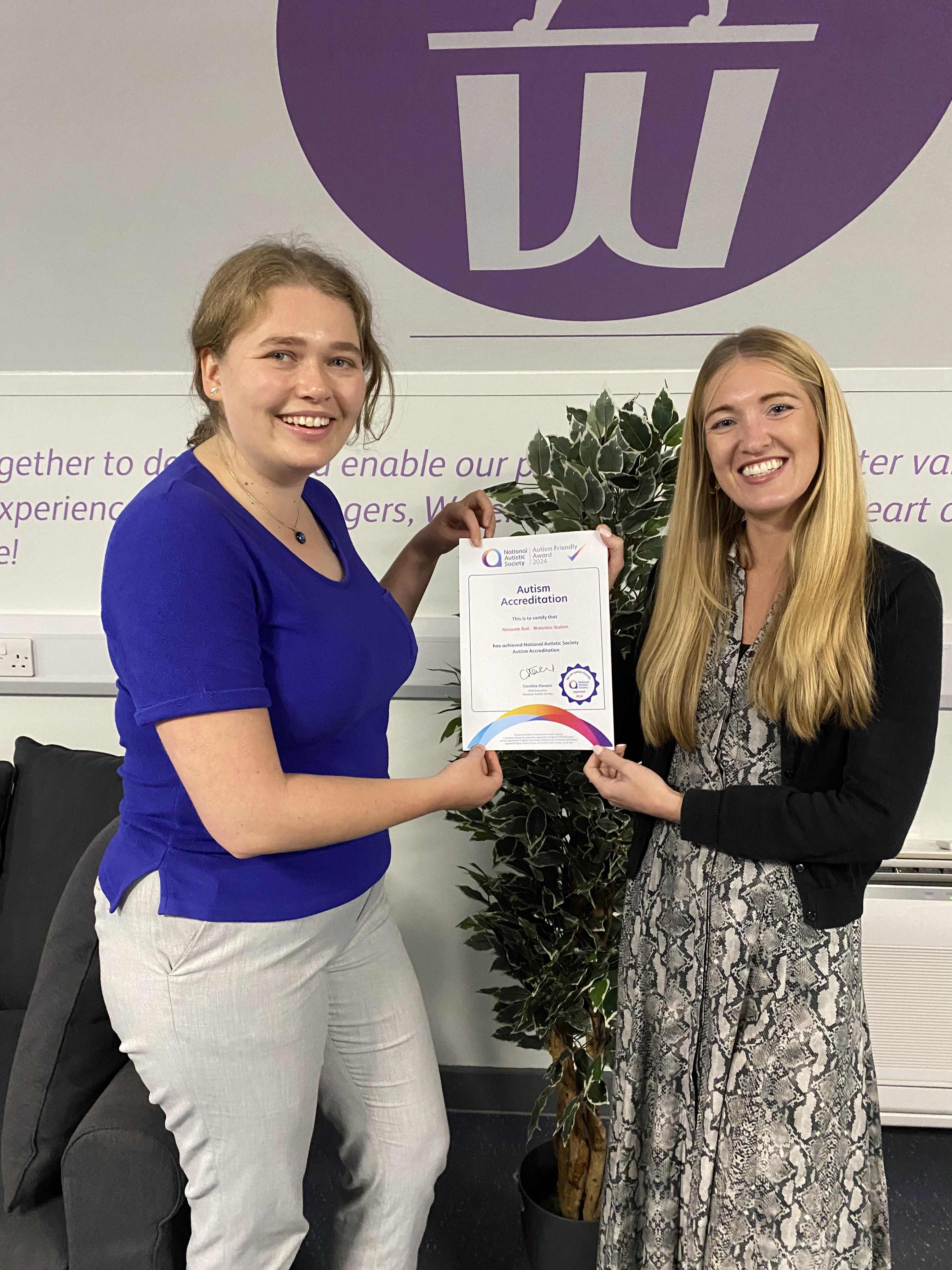Waterloo Station Manager Emily Haggard and Laura Kopelciw, Project Manager for Stations, with the Autism Friendly Accreditation certificate