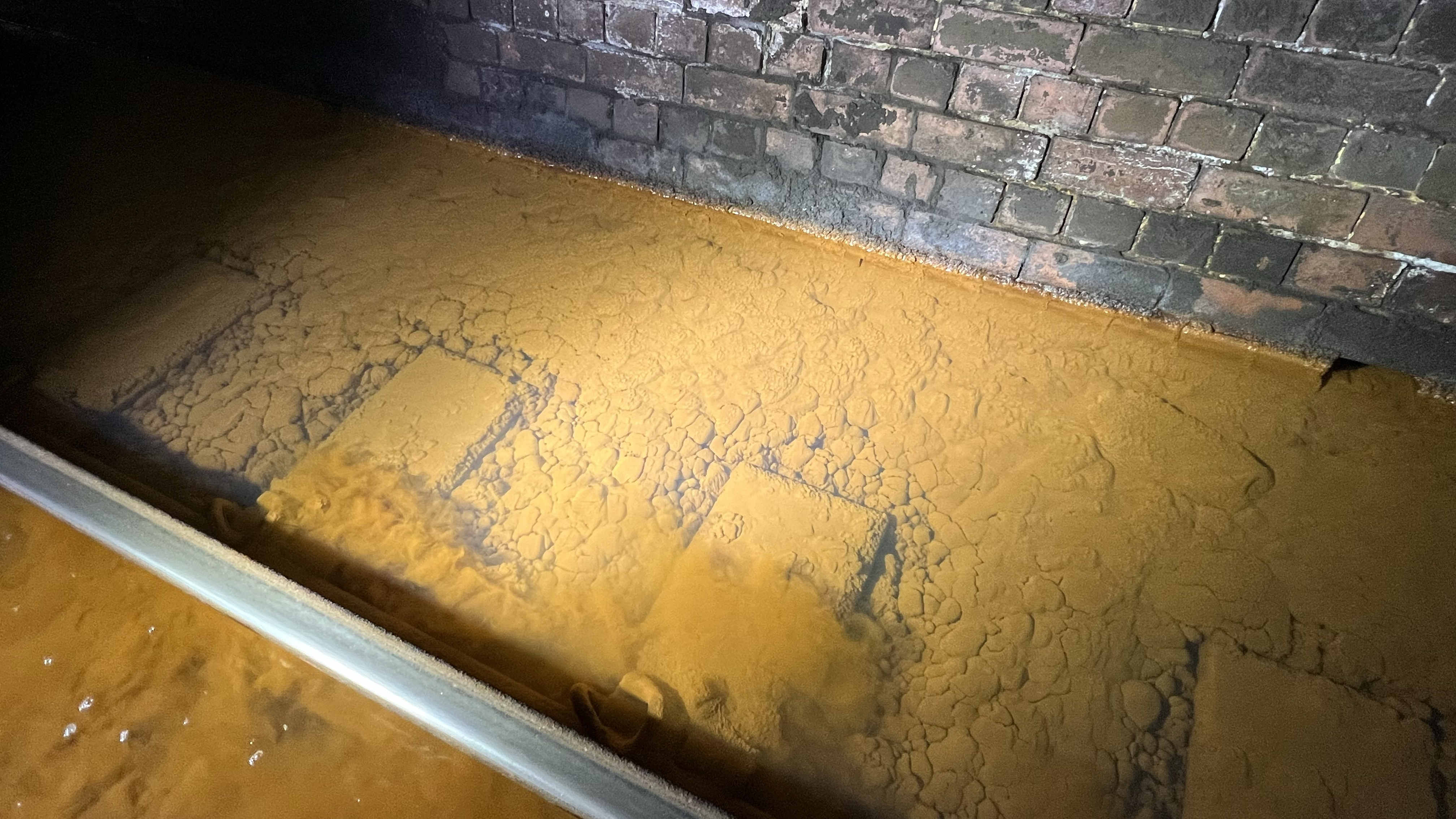 Iron ochre sediment on track ballast inside Whitehaven tunnel November 2023