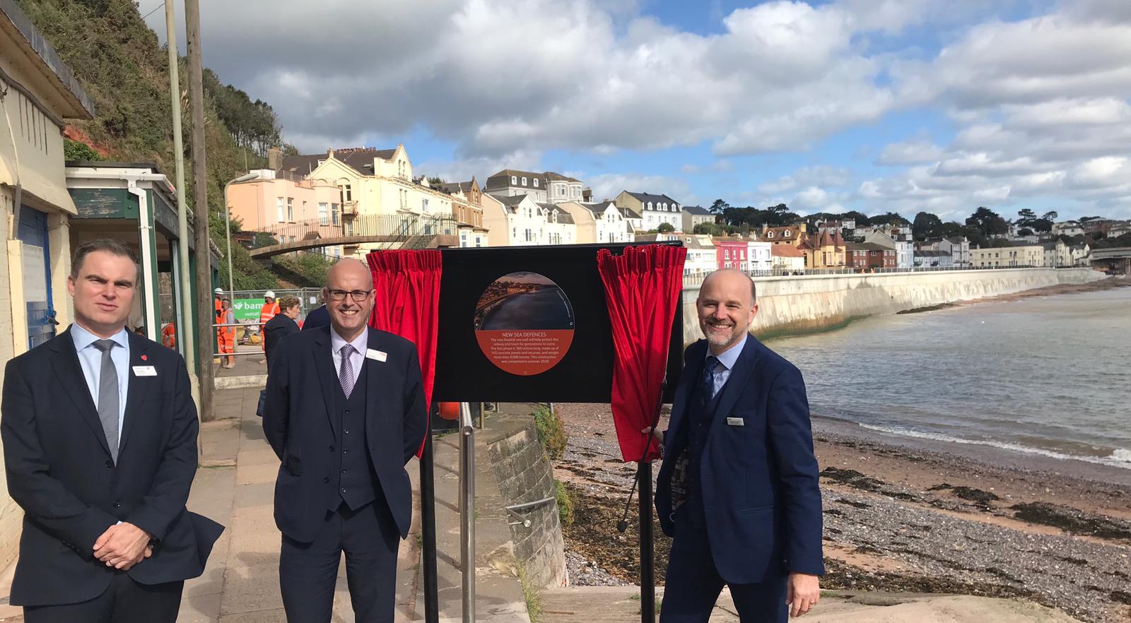 Mike Gallop (middle), Network Rail Western route director, at the first section of the new Dawlish sea wall