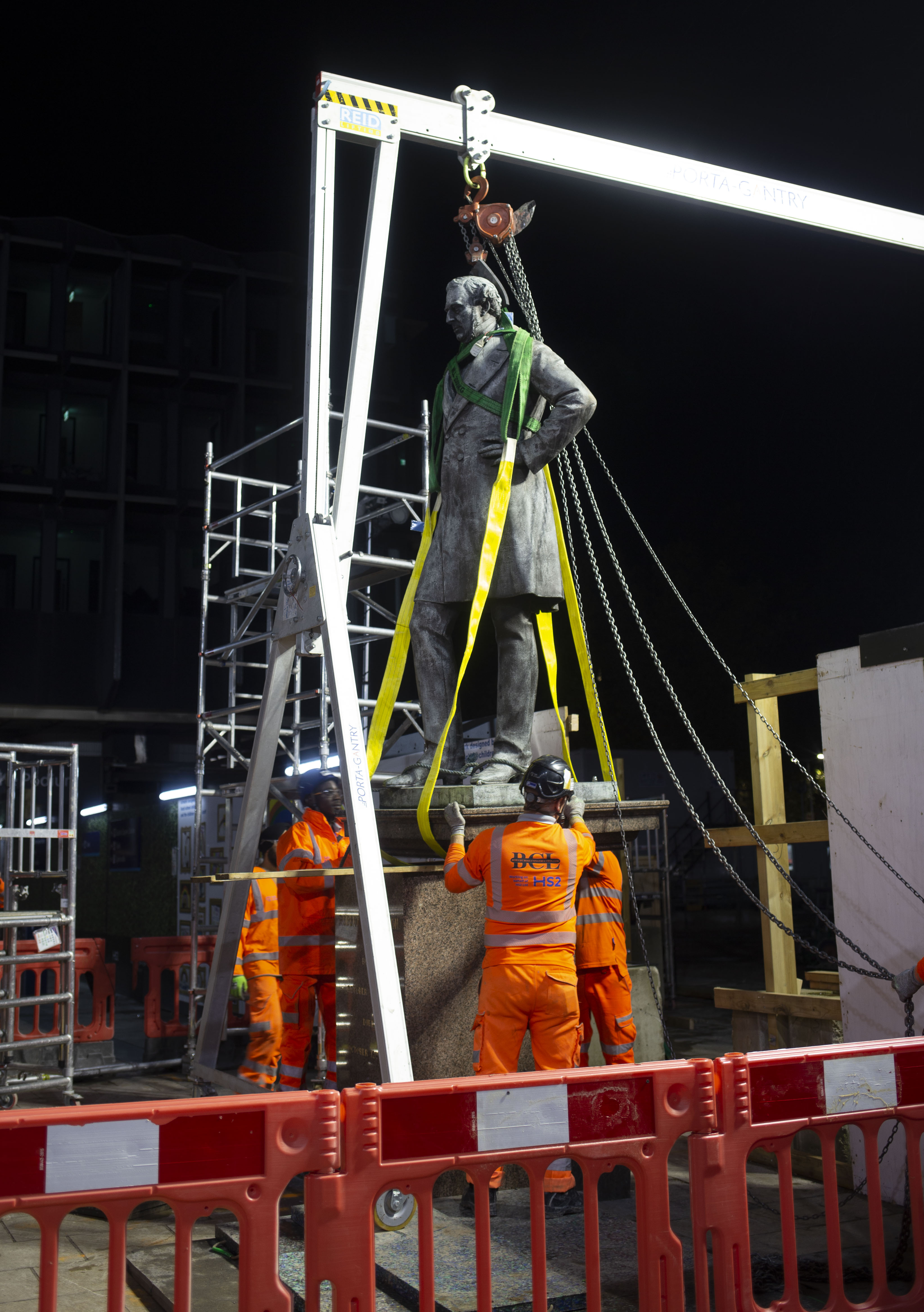 A hoist was used to lift the Robert Stephenson statue overnight on 6 October 2020.jpg