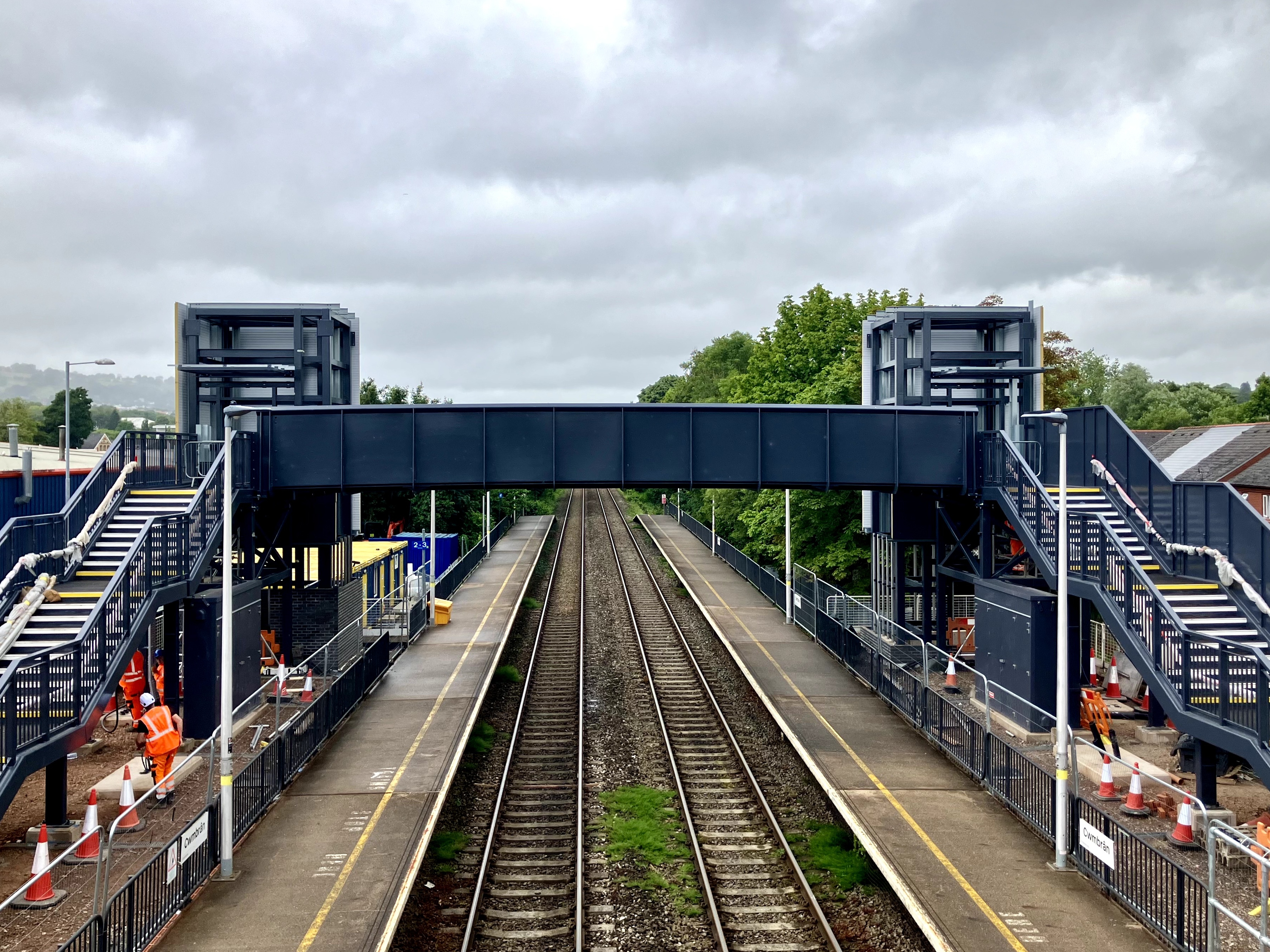 Accessible footbridge under construction at Cwmbran station, July 2024.jpg
