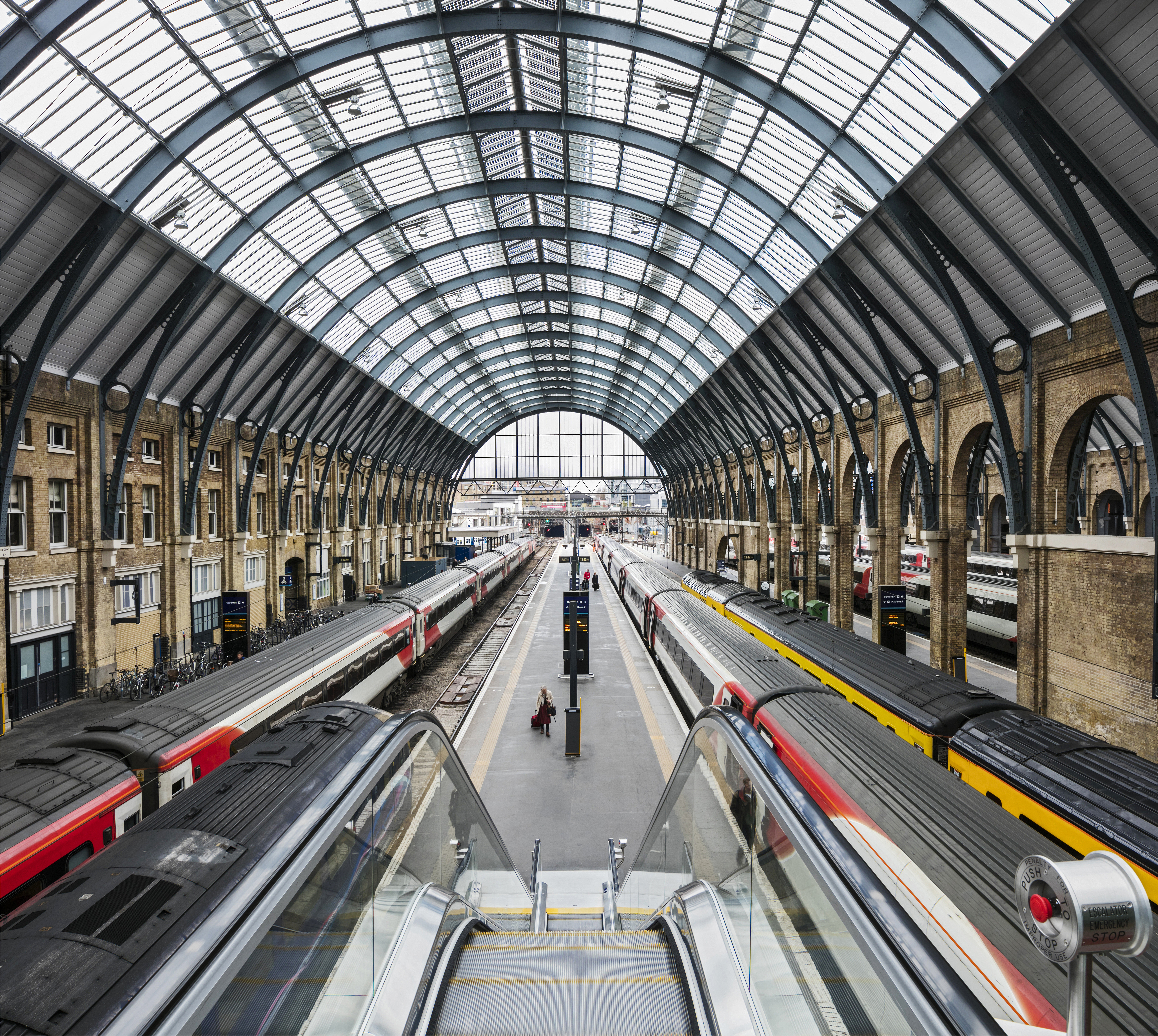 King's Cross railway station - trains at busy platform - view from escalator