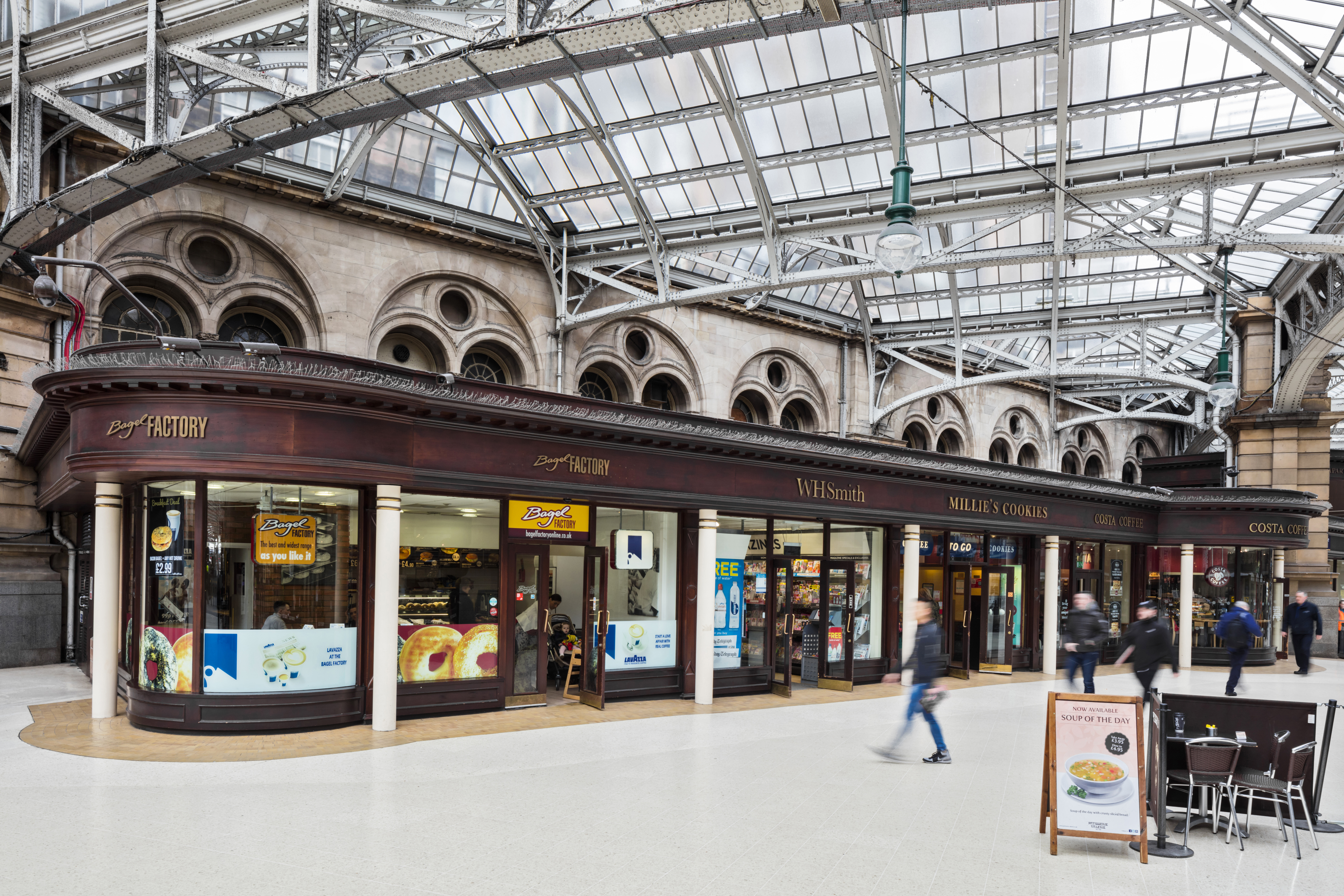Glasgow Central railway station train station retail shops shopping busy crowds