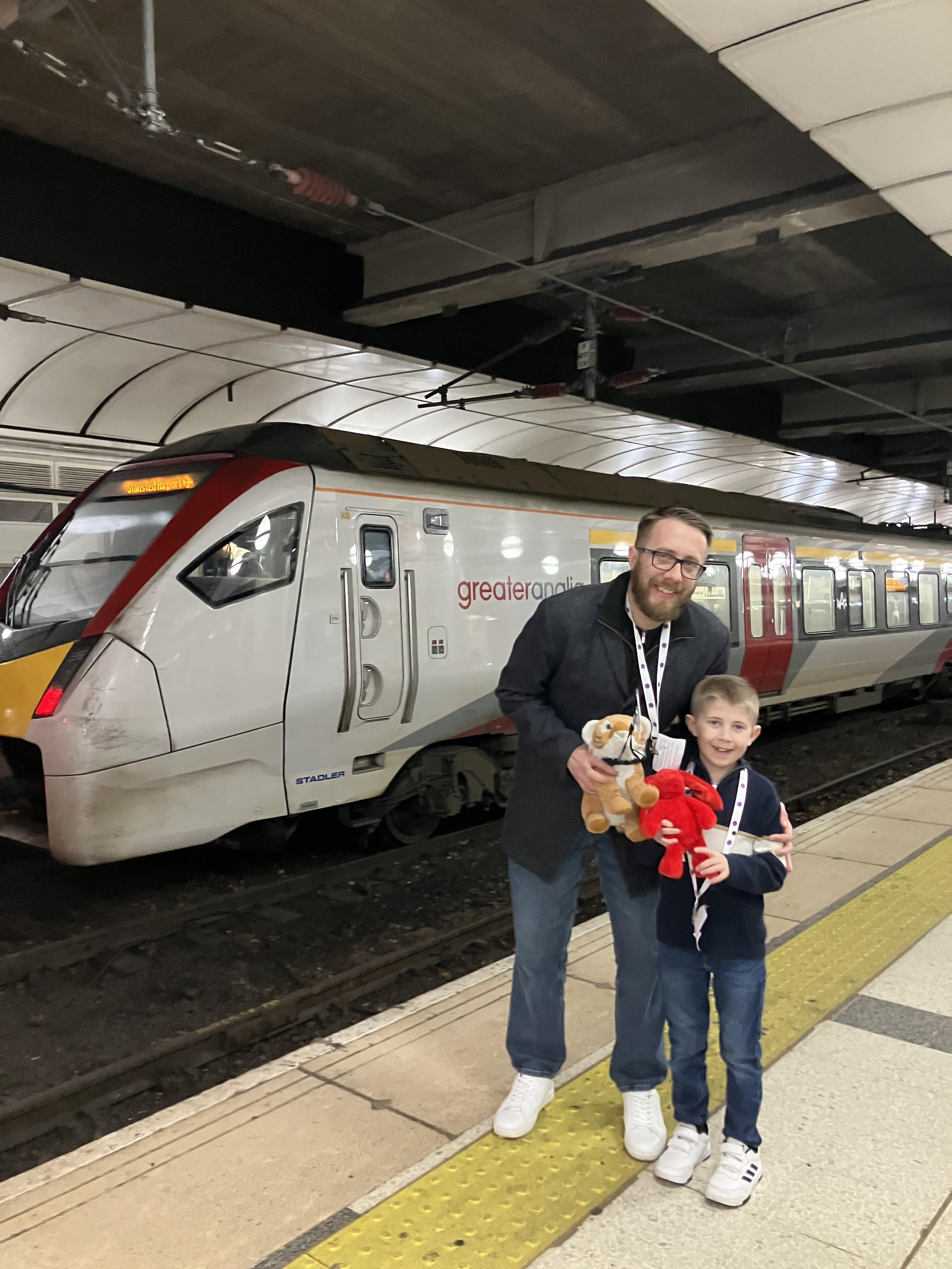 Austin, his dad and friends in front of a Greater Anglia train.jpg