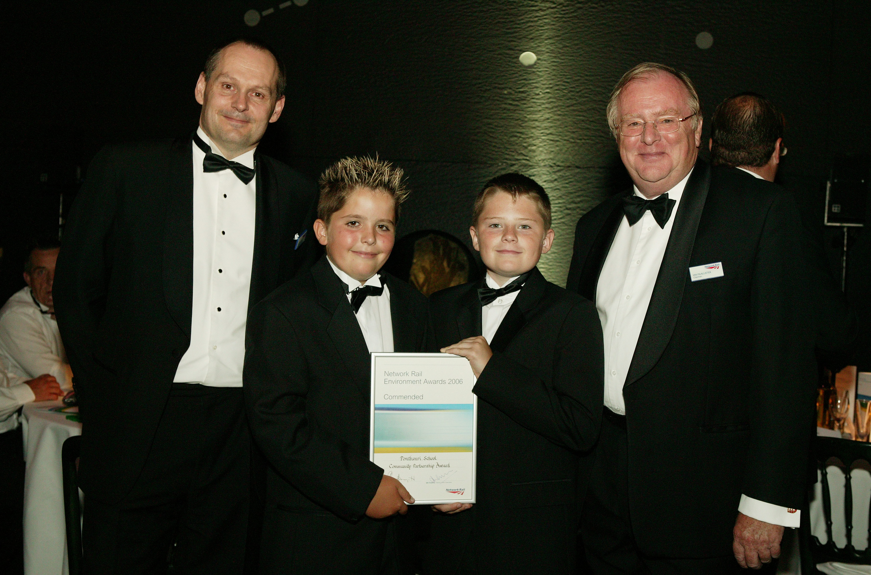 Presented by Network Rail's Chairman Ian McAllister and Iain Coucher, Deputy Chief Executive to Kristian Saunders and Ben Millar. The children were all involved in a clean up campaign to improve their local environment - short listed in the Community Partnership category.