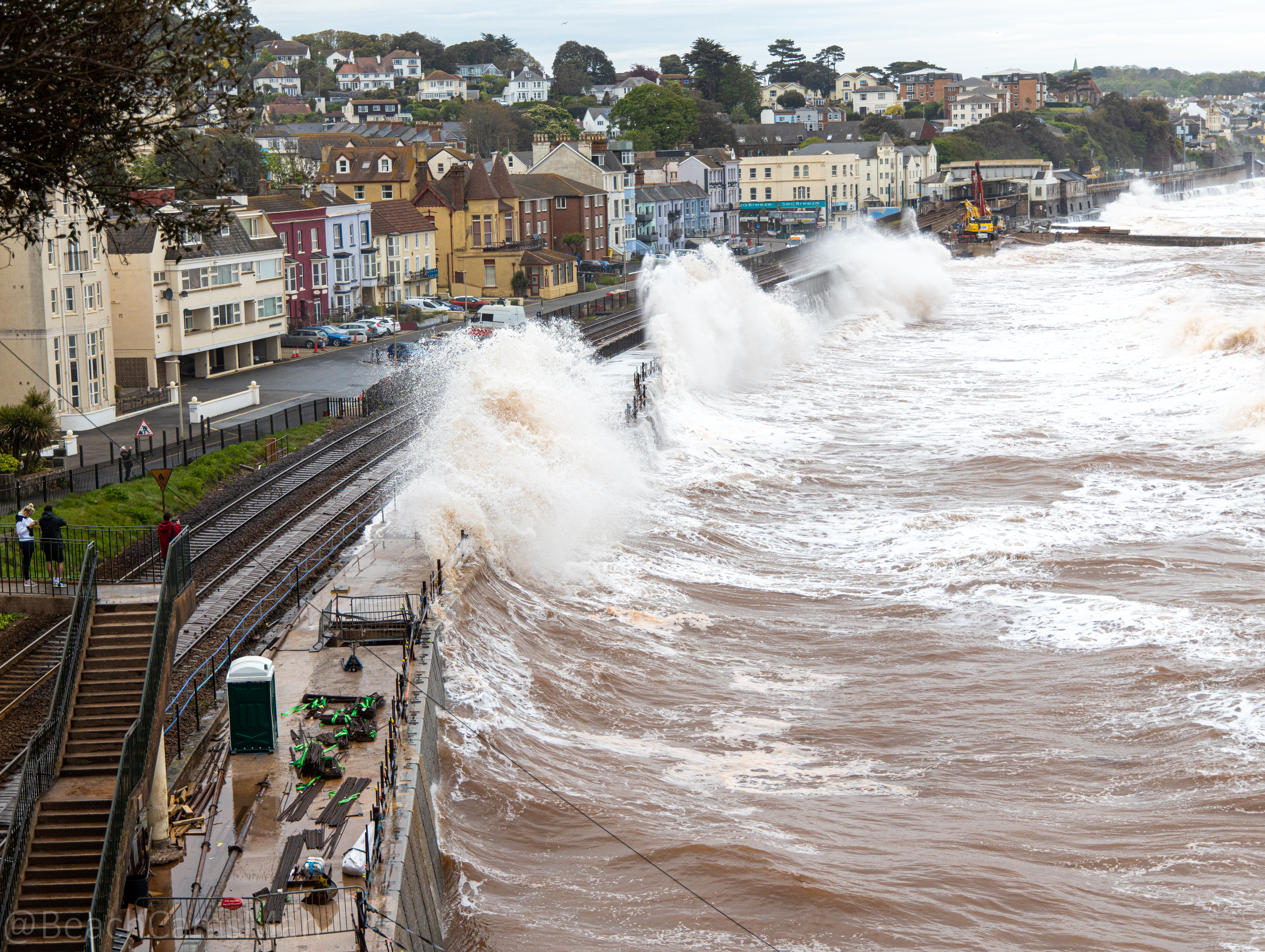 Waves crashing over the first section of new sea wall during construction