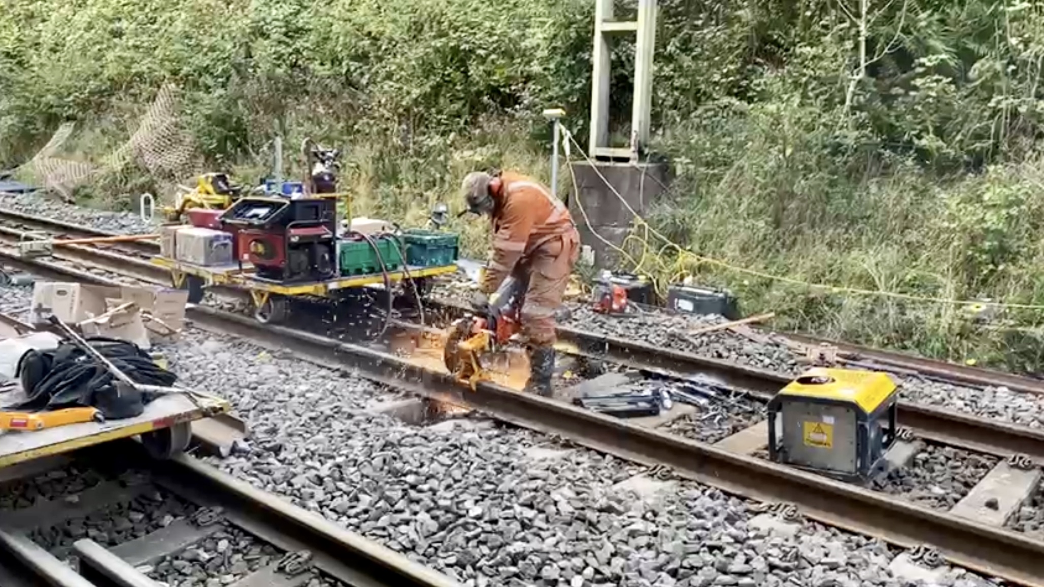 Angle grinding through rail during Beechwood Tunnel track replacement Oct 2022