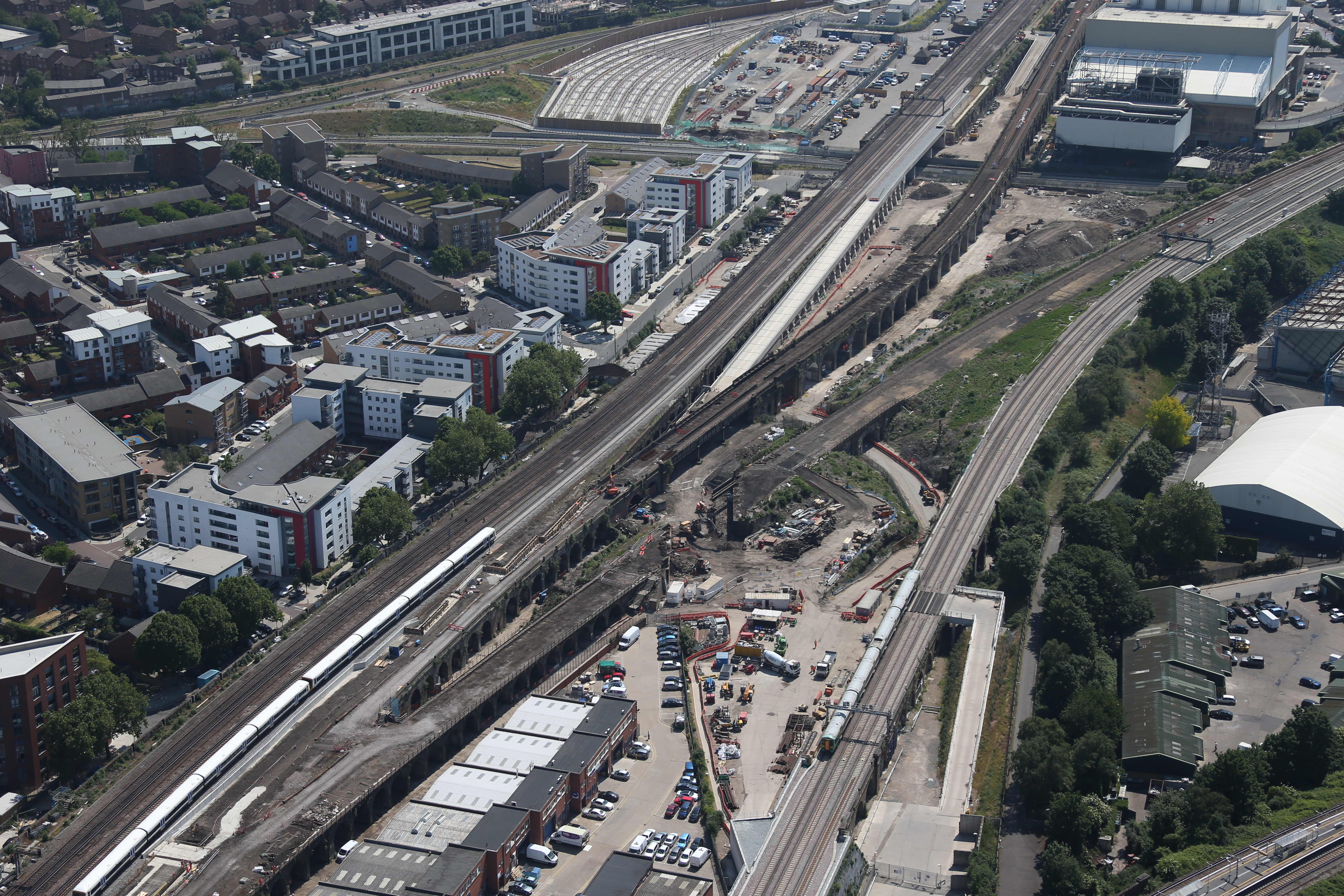 At the start of demolition for Thameslink, this is the Bermondsey Dive Under site from the air. The viaduct and rail line in the middle of the two main routes have now almost completely gone