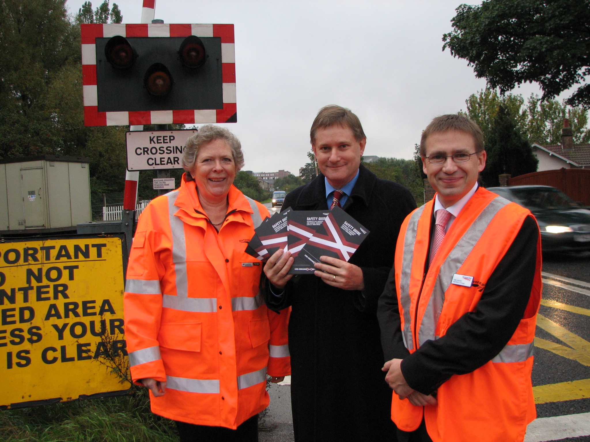 Gaynor Farrington, Level Crossing Risk Control Co-ordinator for Network Rail; Hugh Bayley, City of York MP; and Neil Henry, Area General Manager for Network Rail, at Bootham level crossing in York.