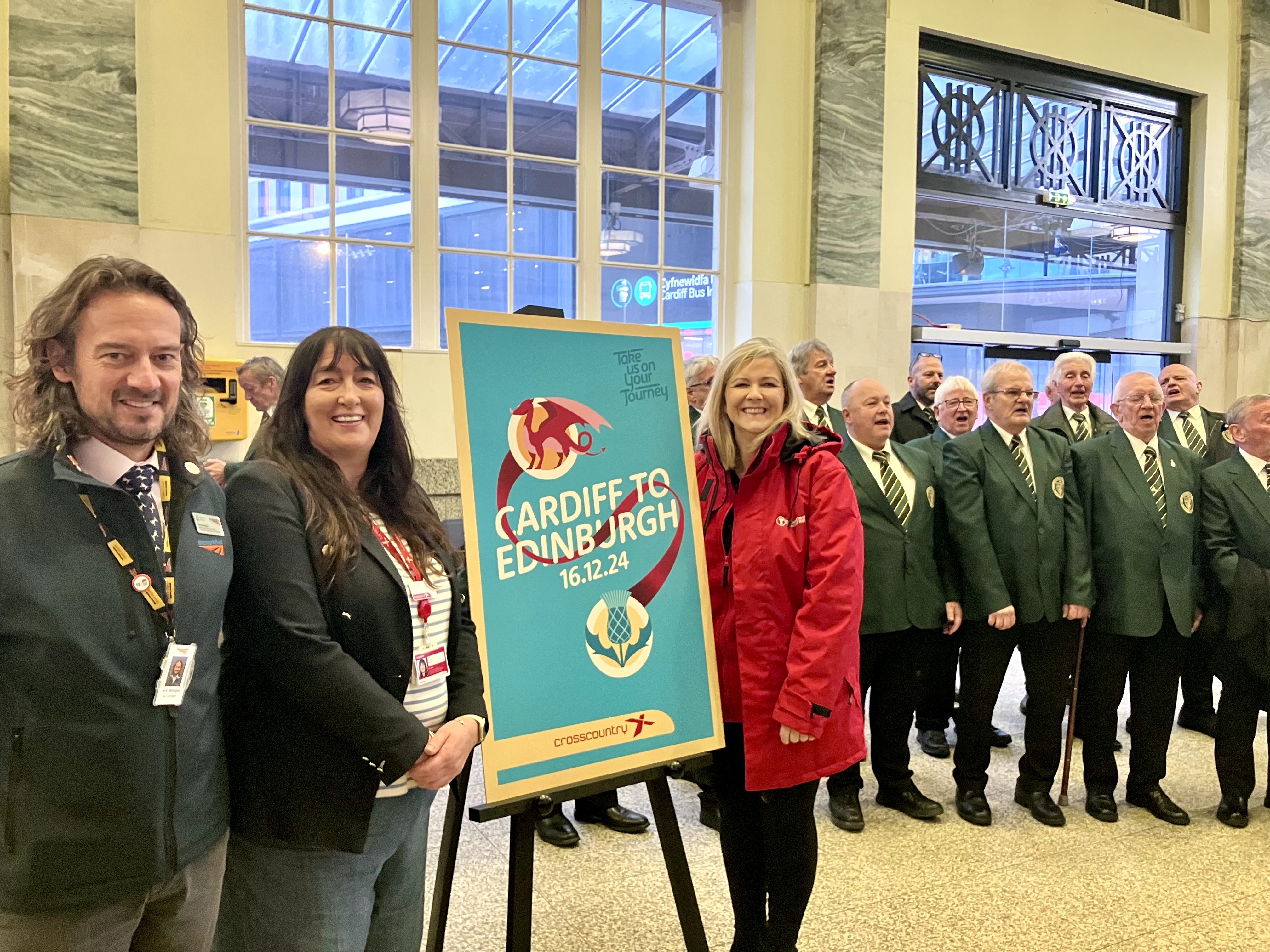 Nick Millington from Network Rail, Bethan Jelfs from CrossCountry, and Marie Daly from Transport for Wales launch the new Cardiff-Edinburgh service at Cardiff Central with the help of the Caerphilly Male Voice Choir.