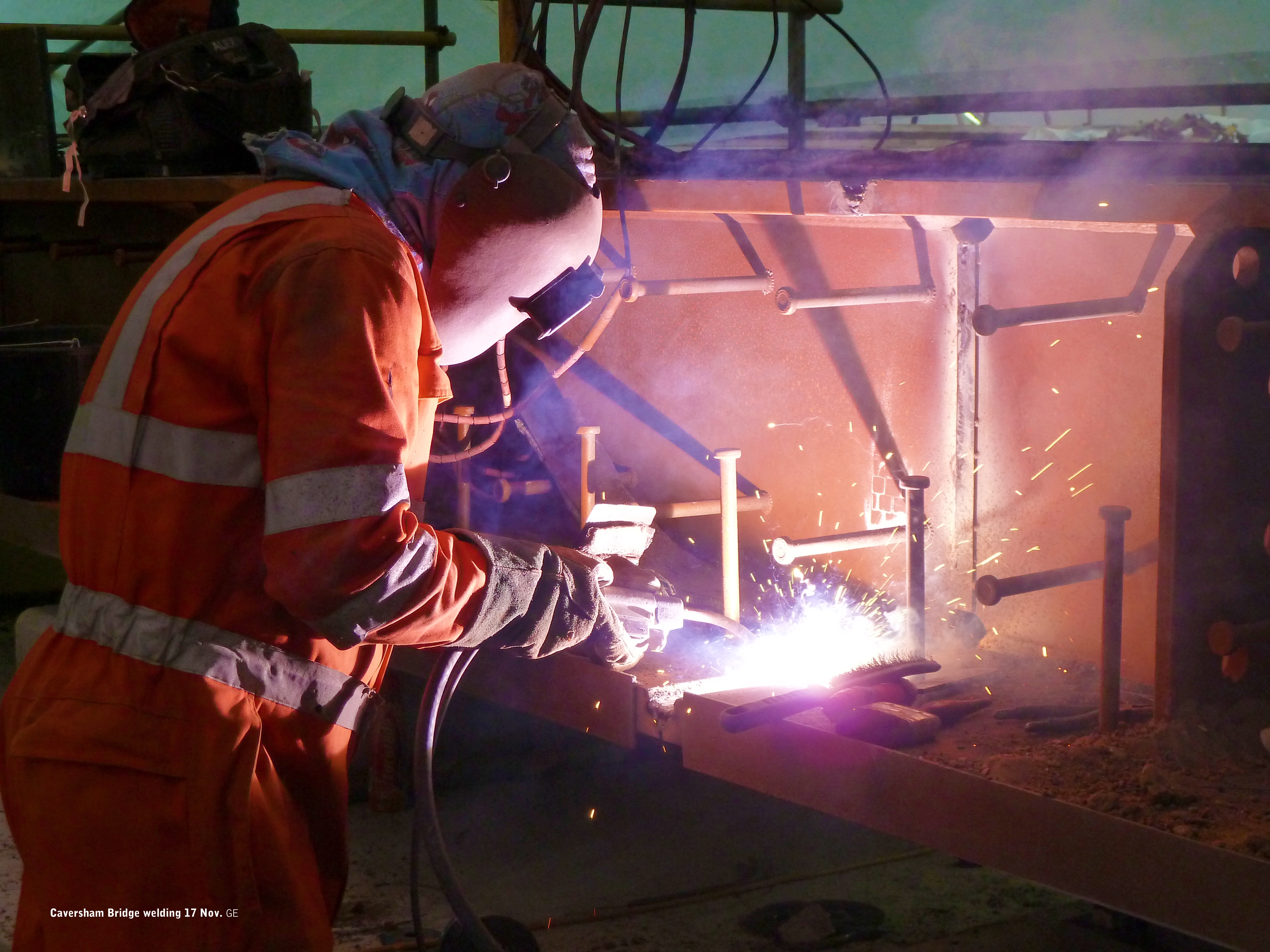 A welder puts the finishing touches in place on the new 10,000-tonne bridge deck which will span Caversham Road and provide extra space for the additional tracks which will serve the four new platforms at Reading.