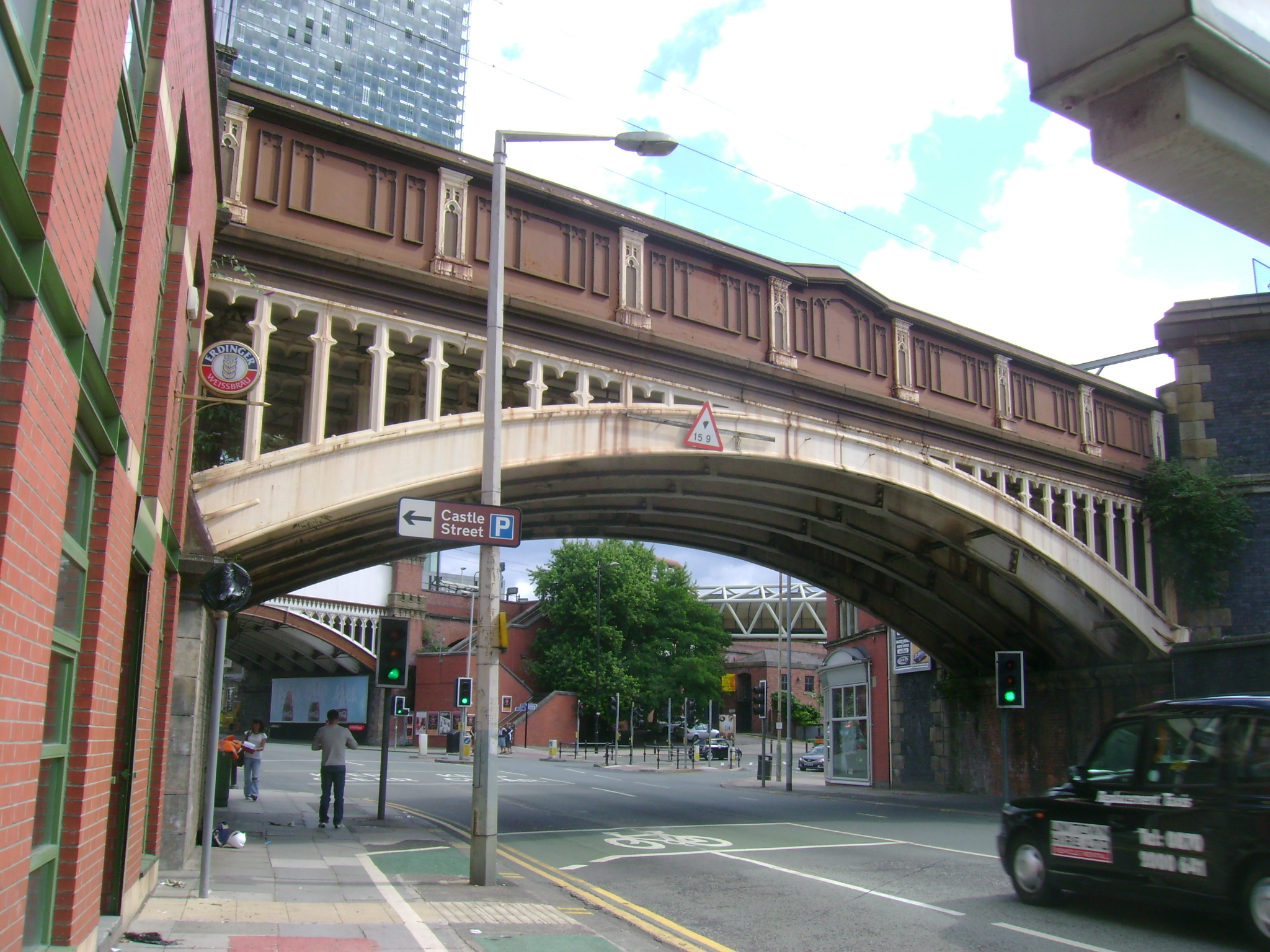 Rail bridge over main road near Deansgate station in Manchester city centre, being refurbished by Network Rail.