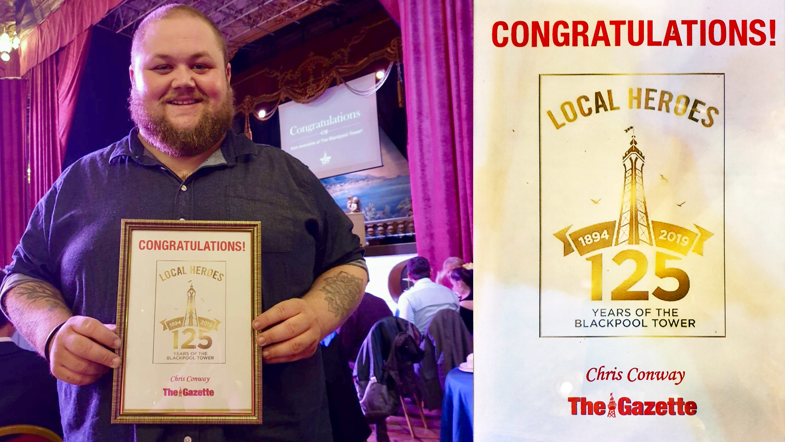 Chris Conway receiving award at Blackpool Gazette's 'Local Heroes' ceremony