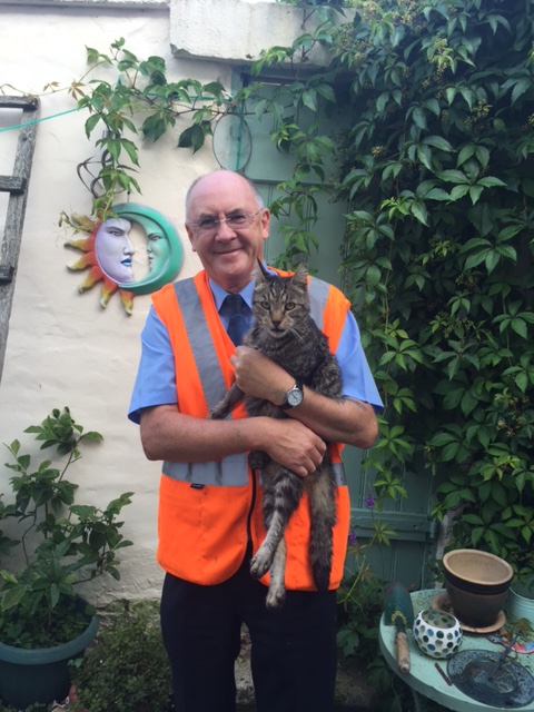 Dave Huntington from Network Rail with Piggy the tabby, the cat he rescued from under the third rail at Bebington station