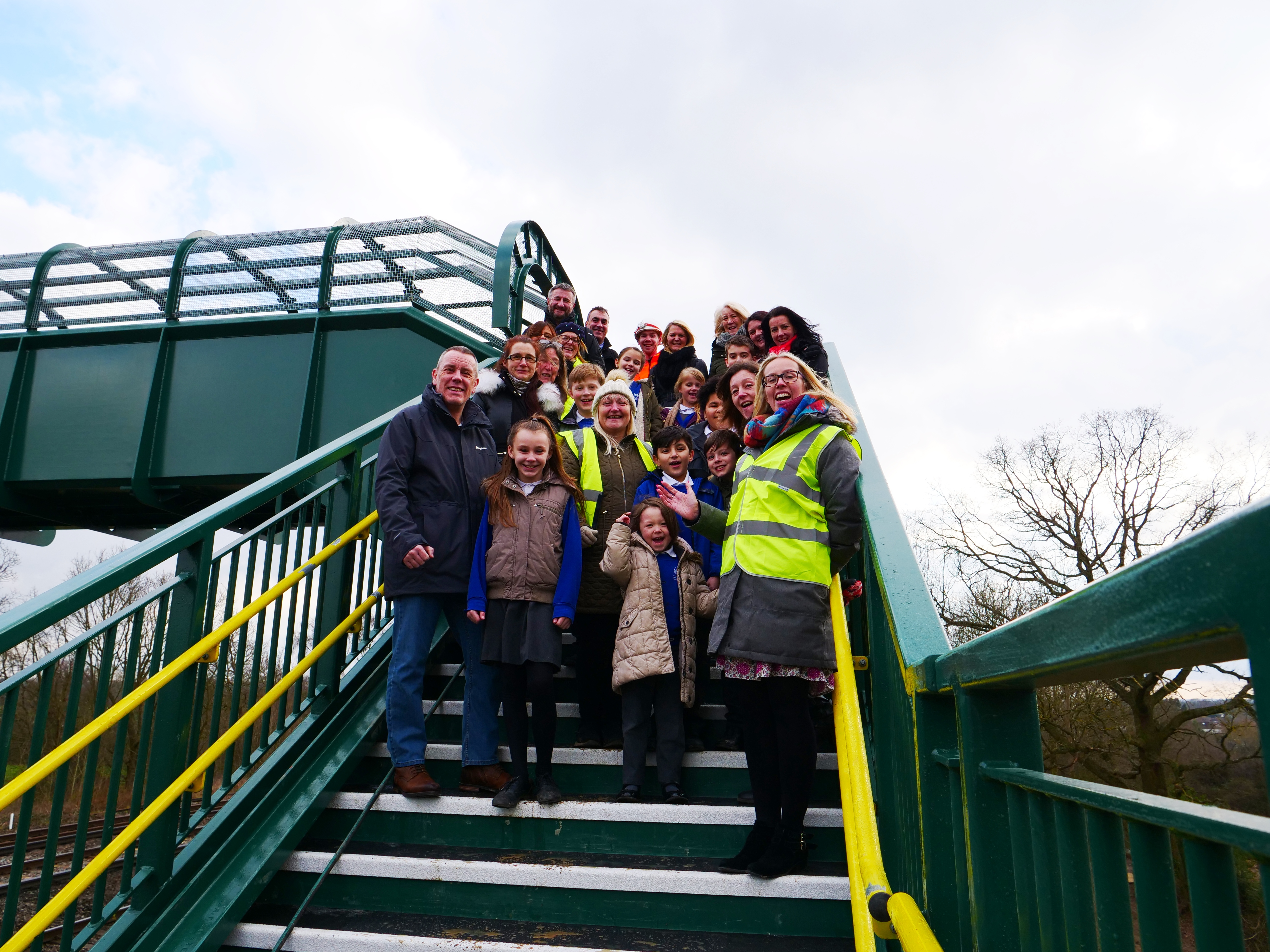 Children, parents and staff from Salfords School celebrate the opening of the new bridge at Dean Farm Crossing, Salfords, Surrey