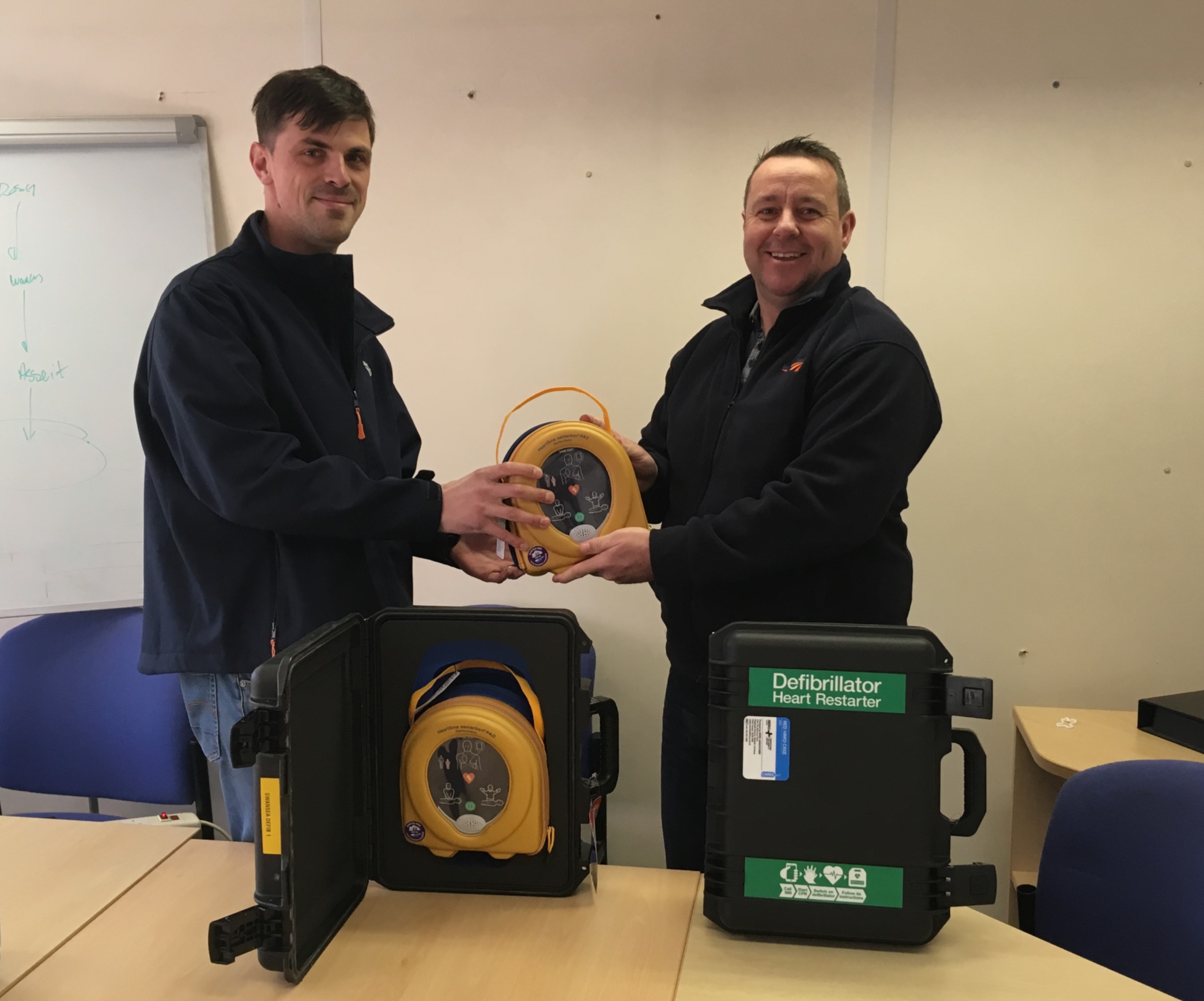 Matthew Oliver, senior technical officer (left), receives a defibrillator for Swansea depot, from David John, project manager (right).