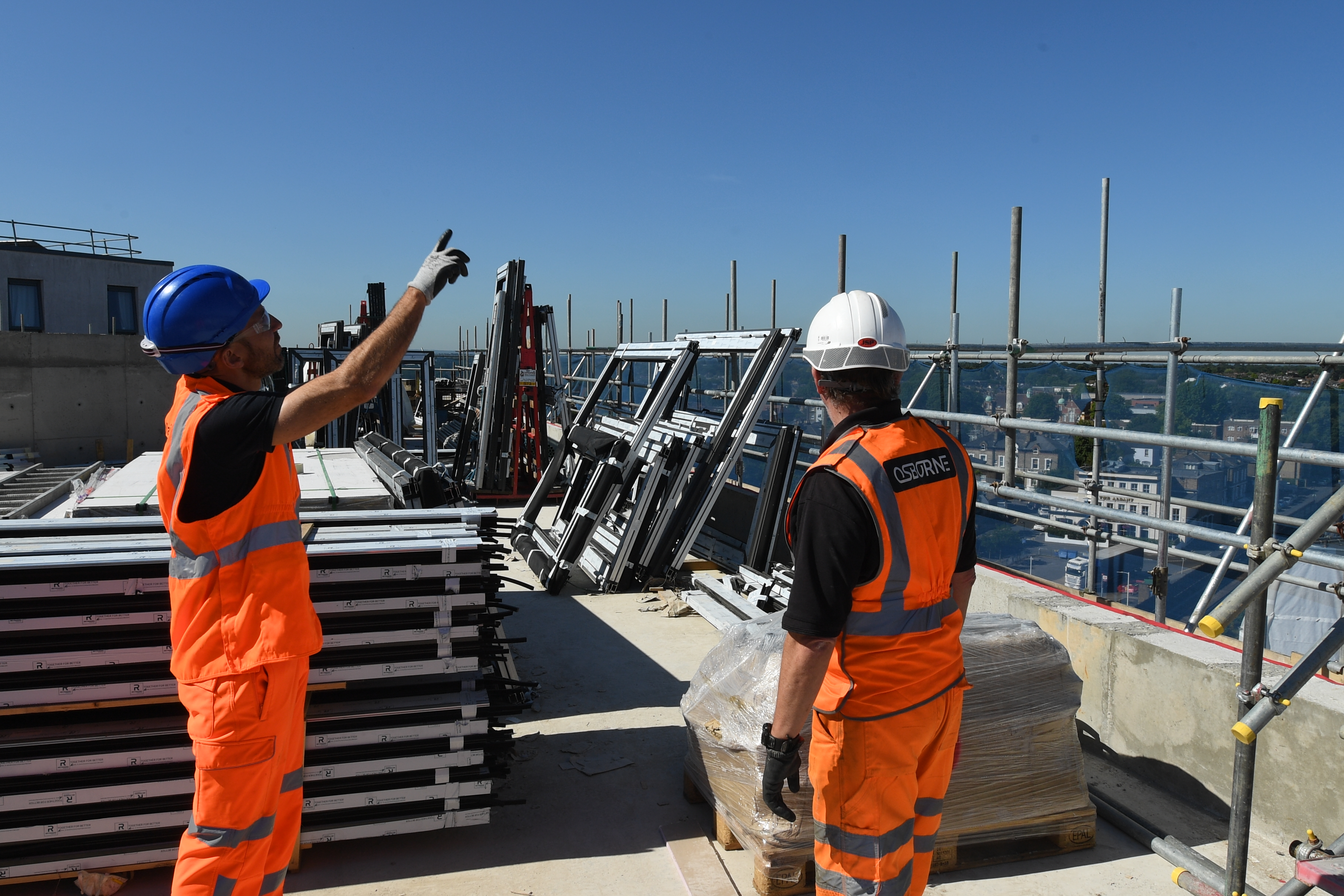Engineers on rooftop worksite next to railway