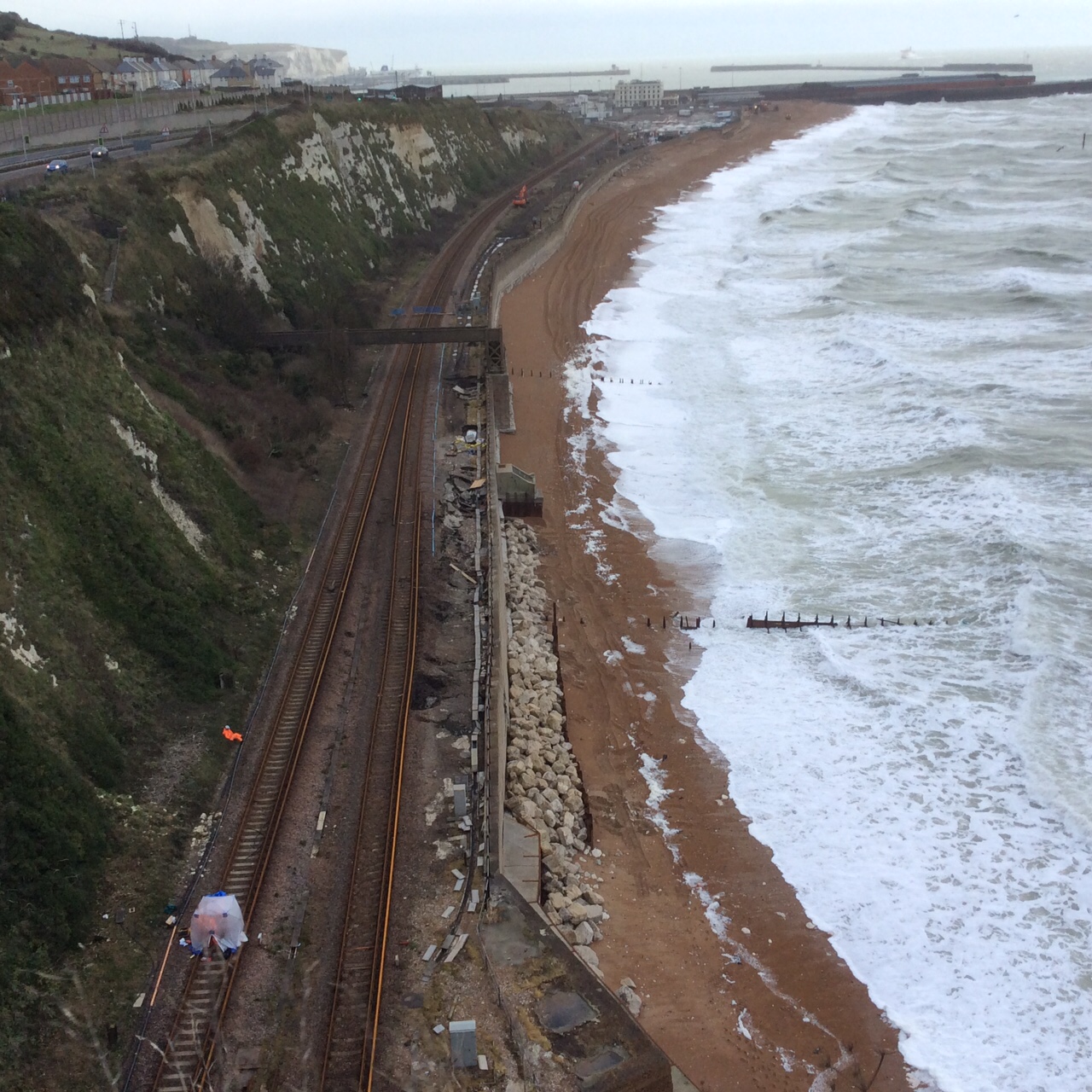 Dover sea wall general view showing the start of the rock armour protection.