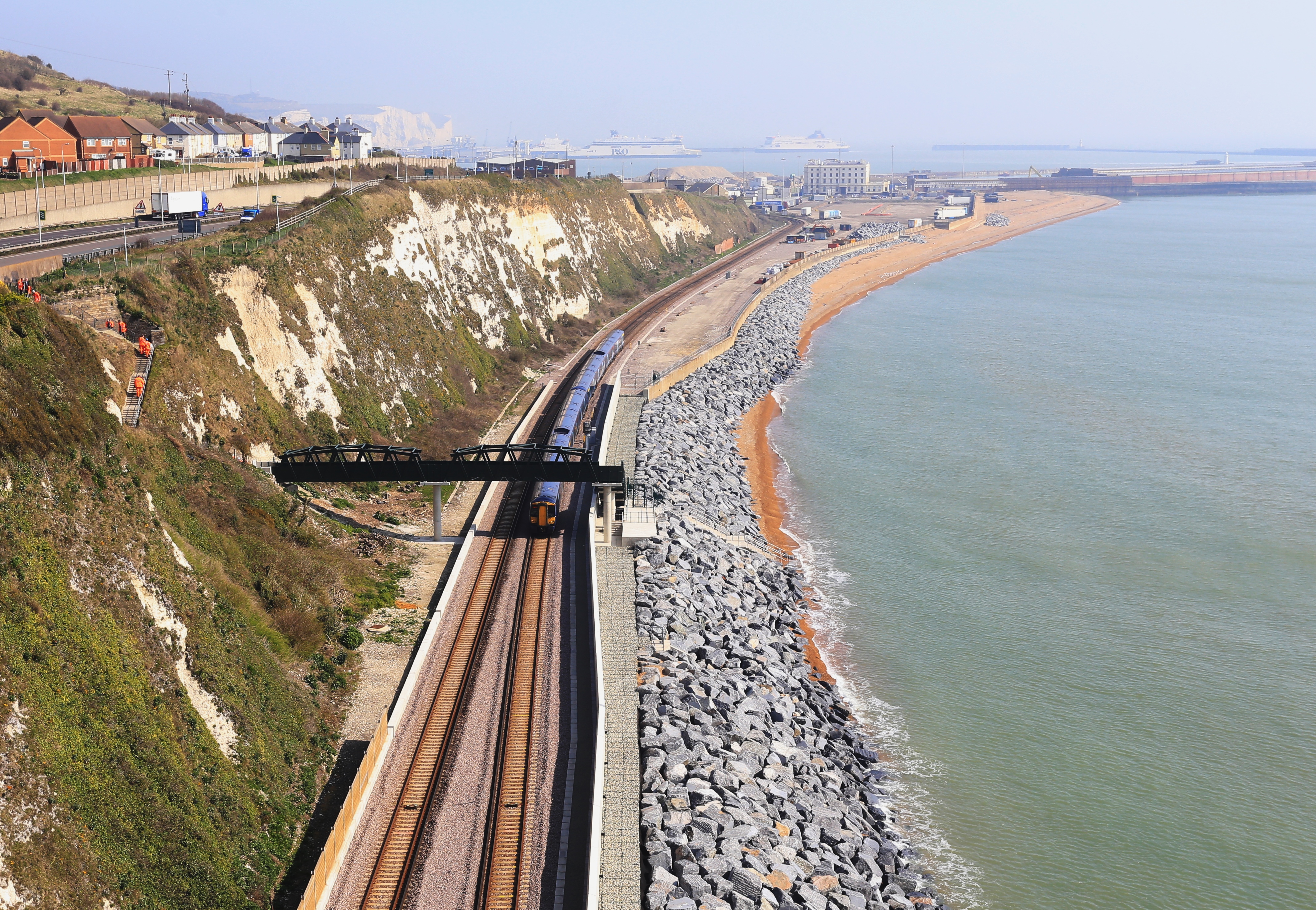 A train passes under the new Wellards Way footbridge at Dover - Shakespeare Beach