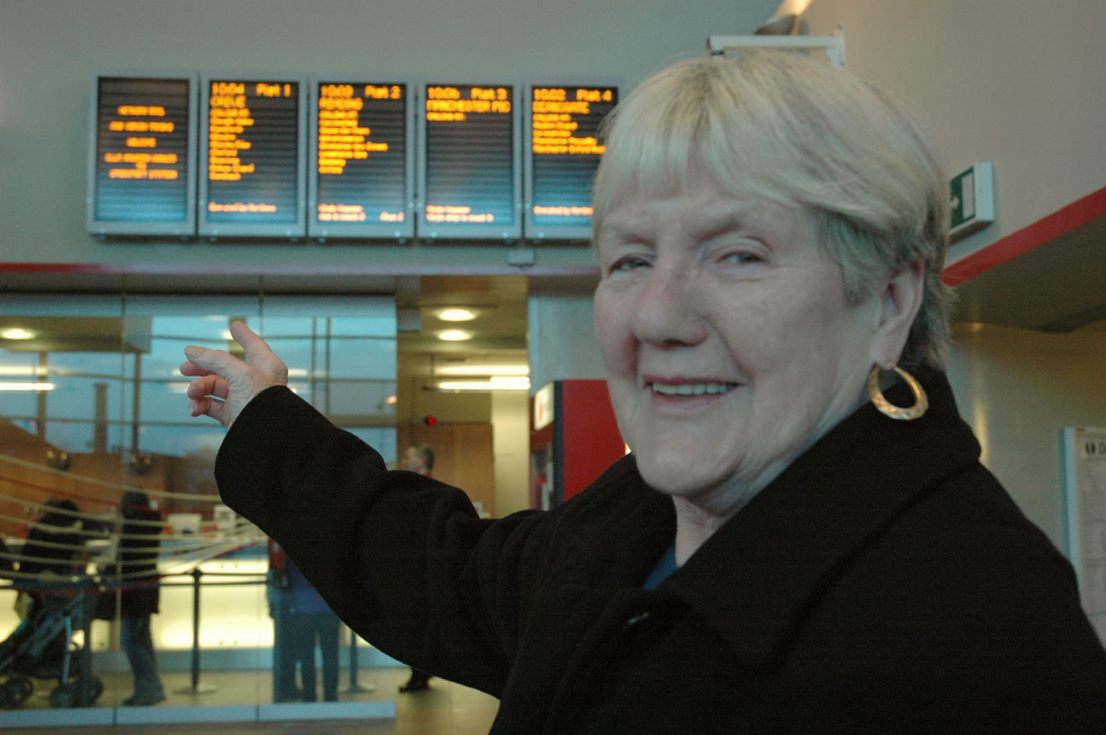Councillor Marueen Rowles pointing to the newly installed information screens above the ticket office at Stockport station (11 December 2006).
