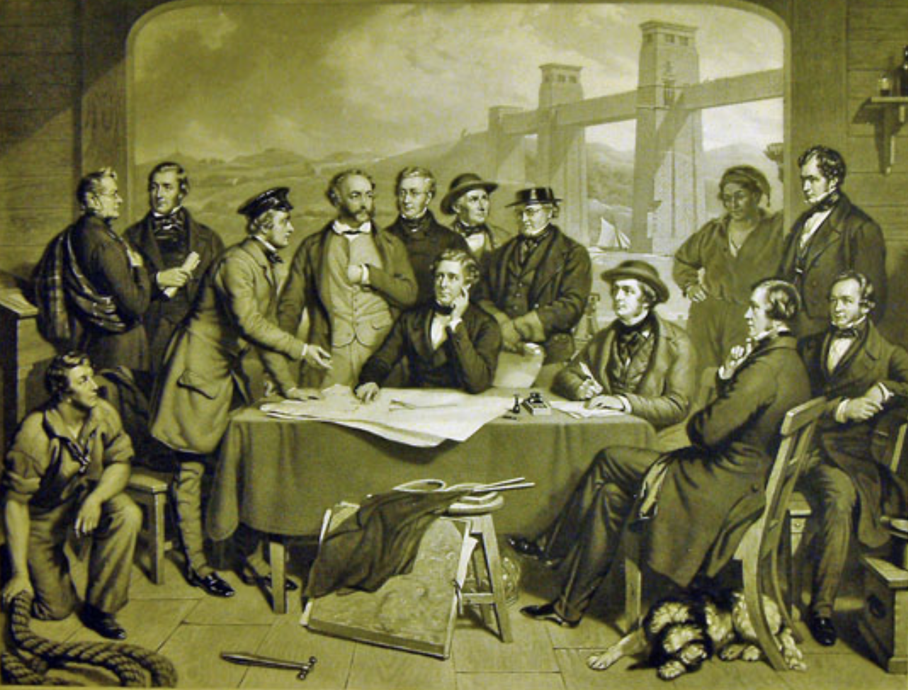 Britannia Bridge - Robert Stephenson and celebrated engineers raising the tubular bridge conference, by John Lucas, circa 1858 - credit NRM York..png