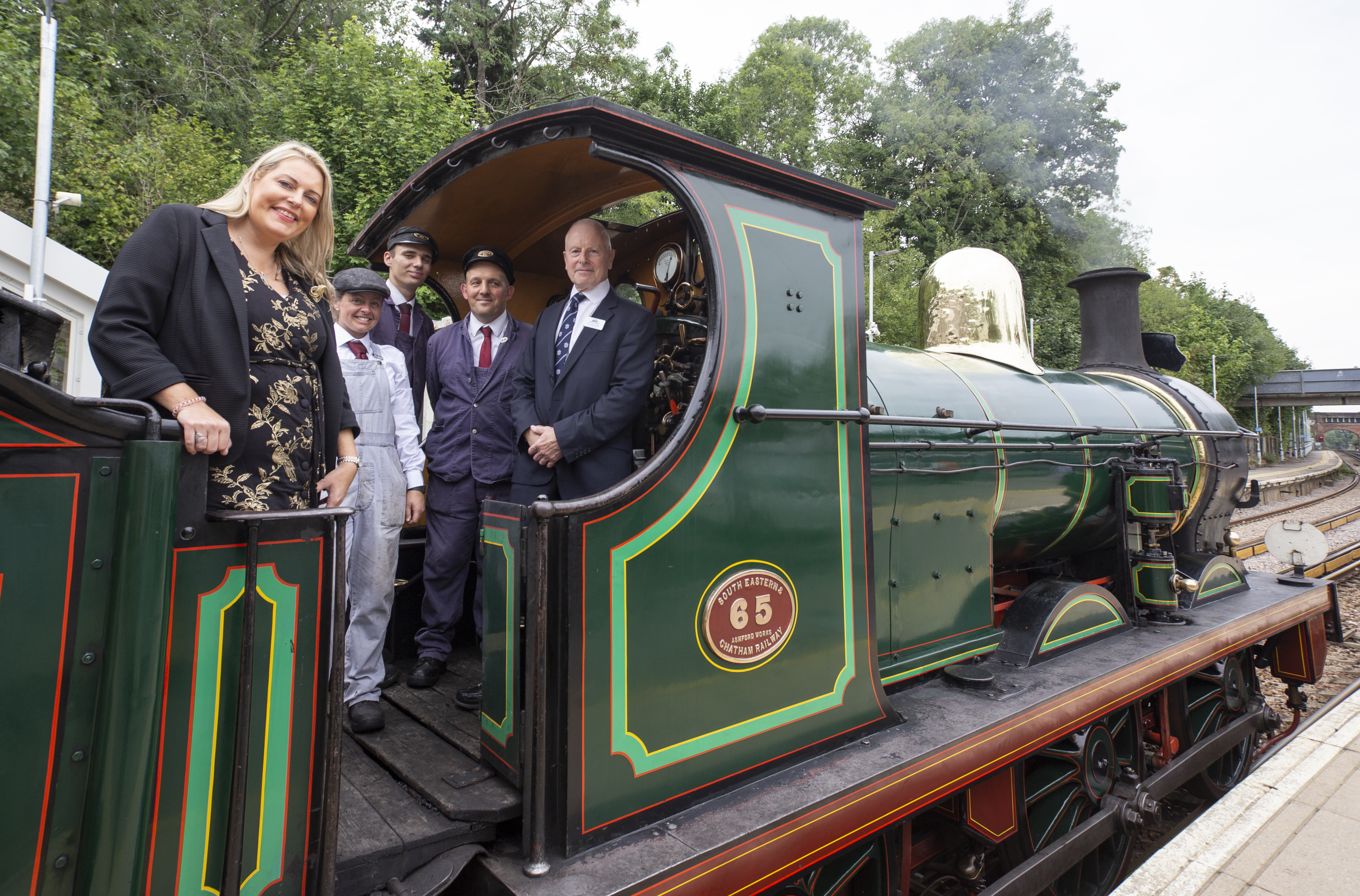MP for East Grinstead Mims Davies with train crew and Bluebell Railway Vice President Roy Watts MBE