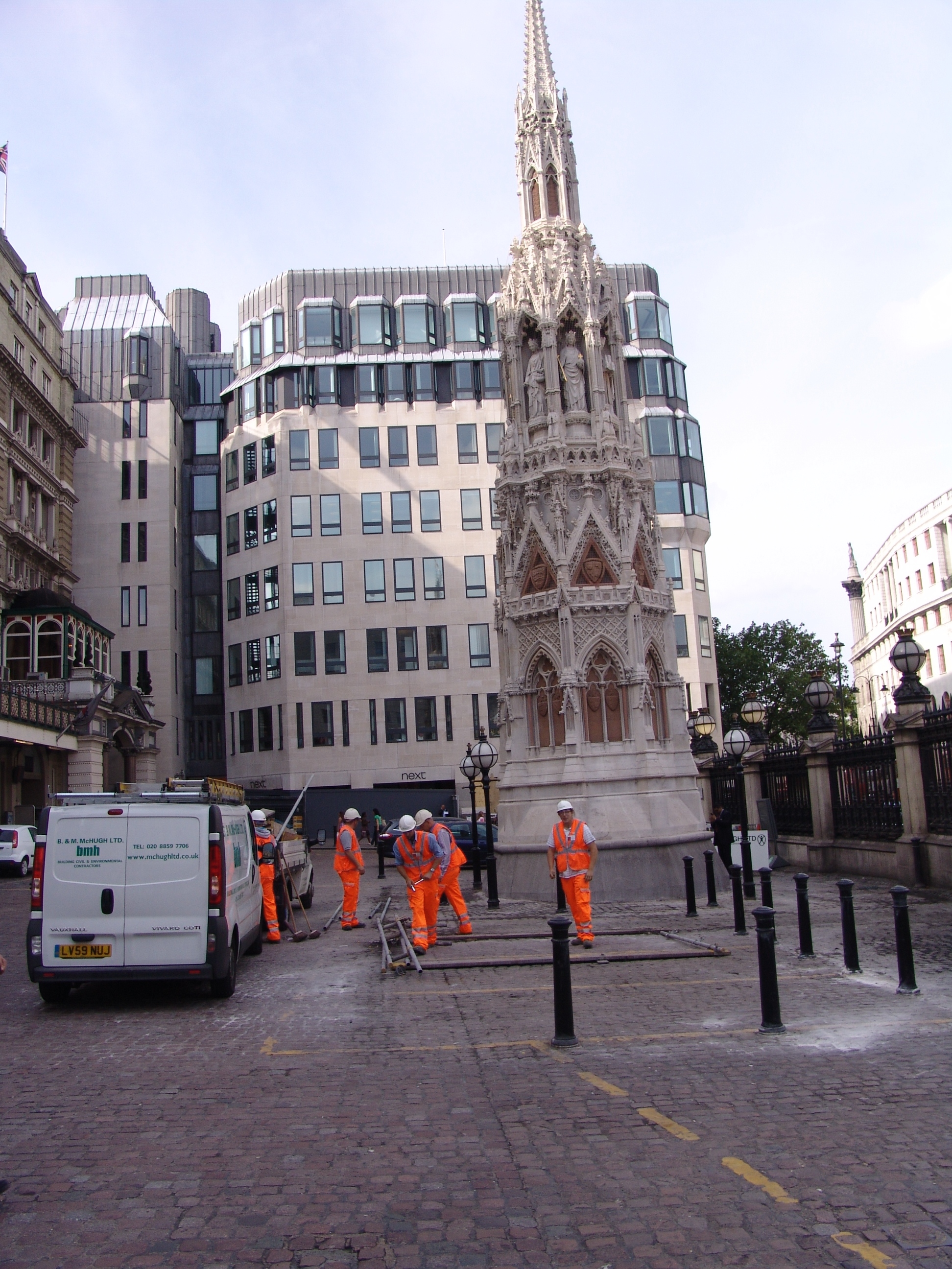 The final pieces of scaffolding around the Eleanor Cross are removed