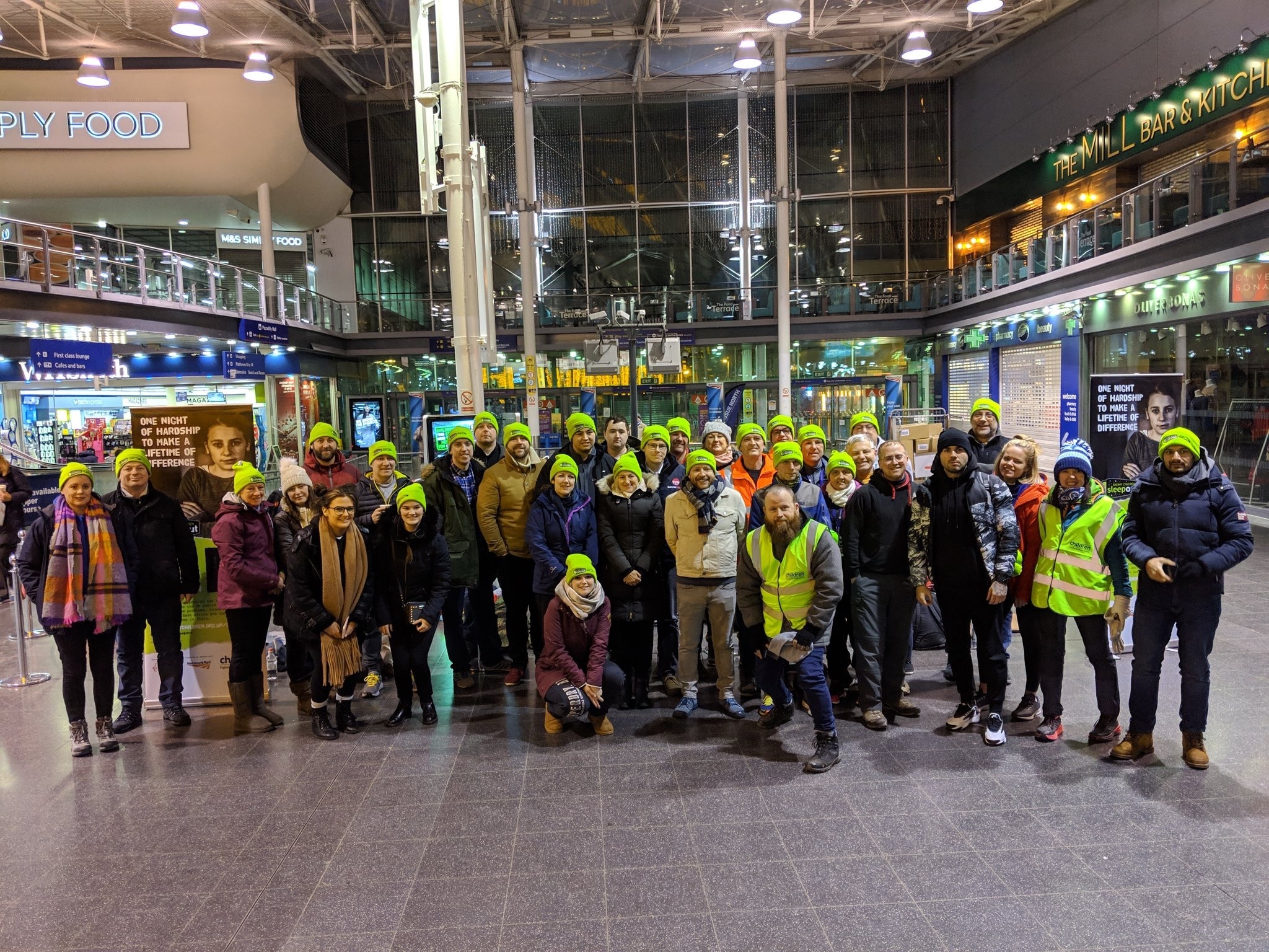 Everyone who took part in the Railway Children sleep out at Manchester Piccadilly
