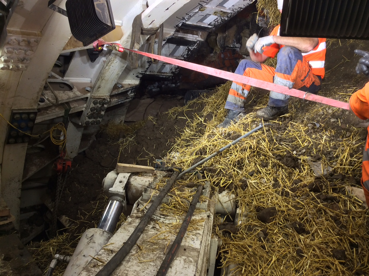Farnworth Tunnel - engineers on top of material which has poured into the tunnel boring machine