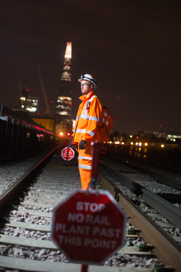 Stunning night time shot of a Network Rail engineer working on track as part of the rebuilding of London Bridge station, with the Shard lit up in the background.