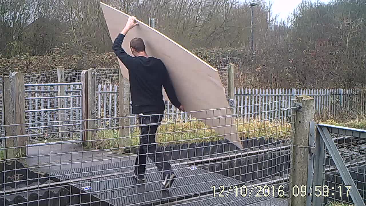 A man carries a large piece of building material over the level crossing at Griffin Lane, Aylesbury