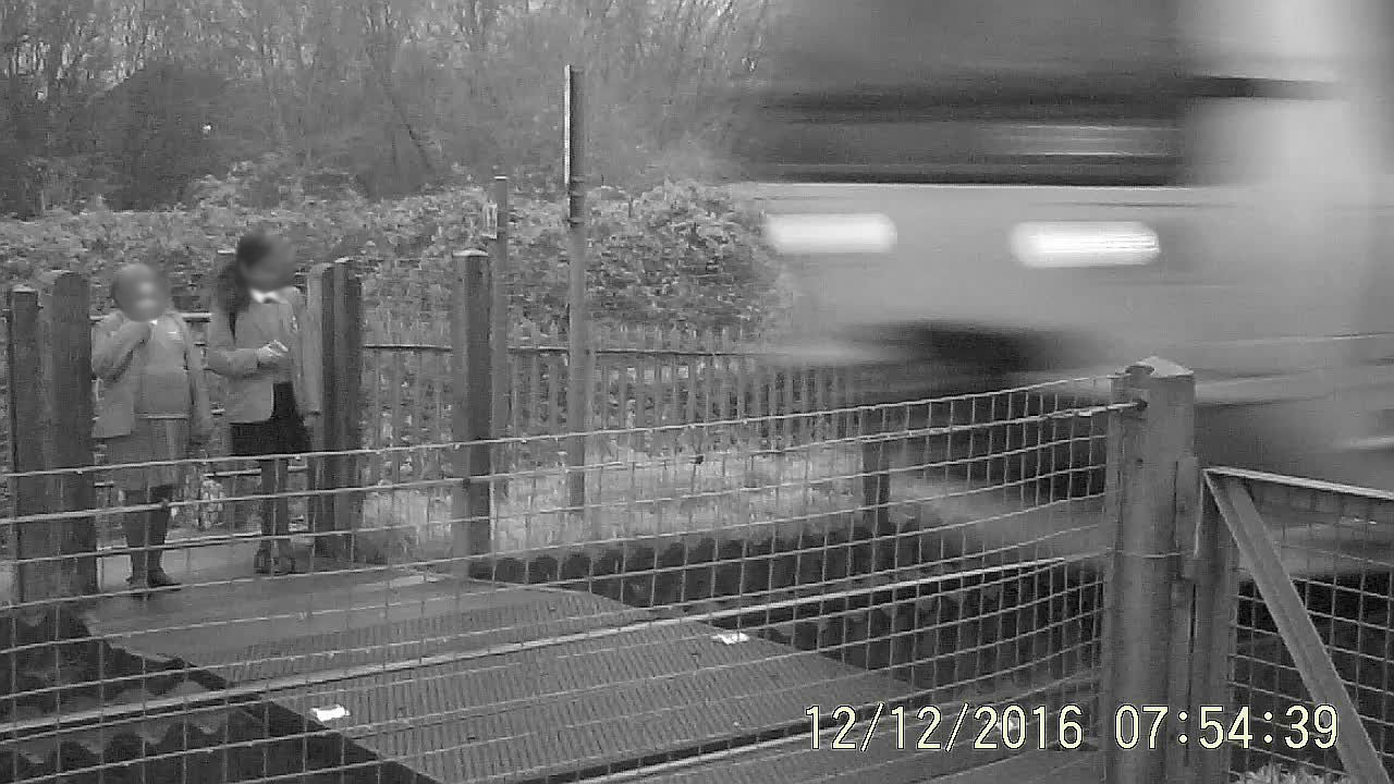 Two school girls stand and wait at Griffin Lane level crossing on the wrong side of the safety gate