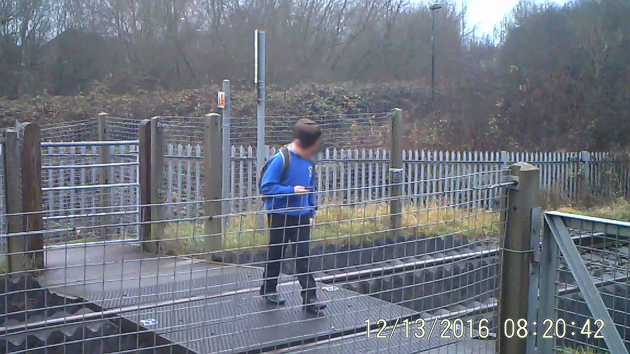 A schoolboy looks at his mobile phone while crossing the railway line at Griffin Lane, Aylesbury