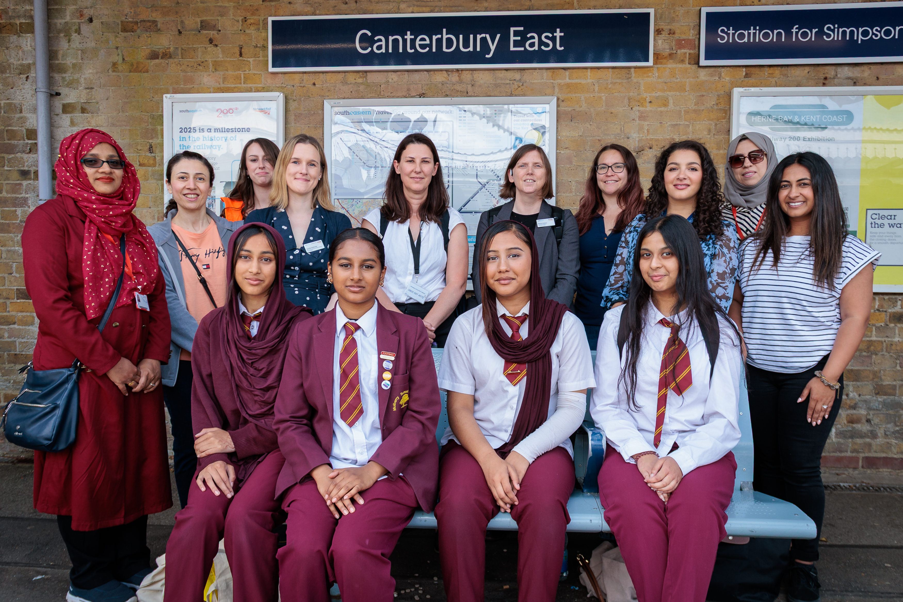 Group of rail engineers and schoolgirls at Canterbury East station