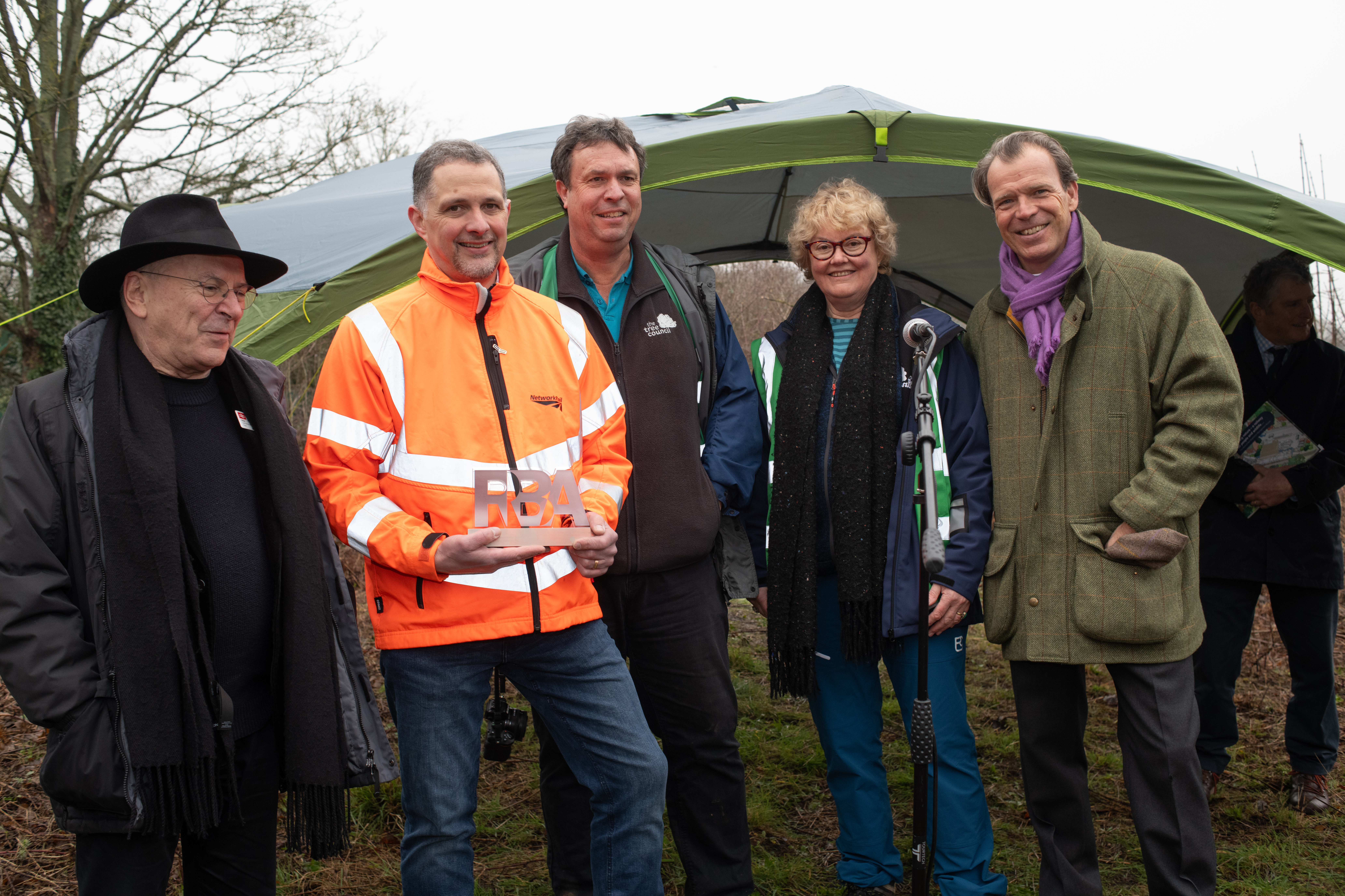 Network Rail Chair Lord Hendy of Richmond Hill, Network Rail Biodiversity Strategy Manager Neil Strong, Tree Council Director of Trees Jon Stokes, Tree Council Chief Executive Sara Lom, and Tree Council Chair Joel Cadbury.