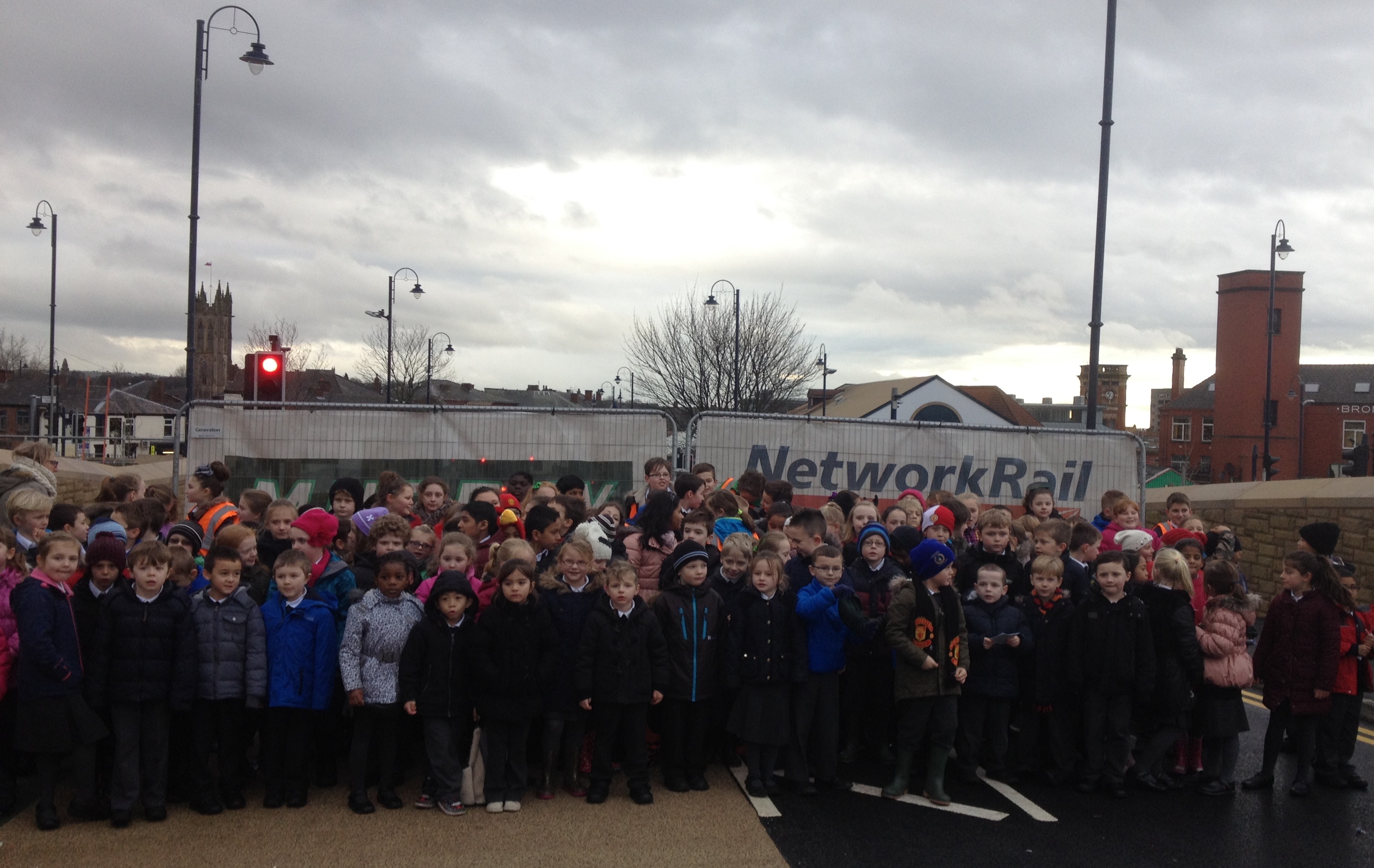 Children from St. Christopher’s R.C Primary School in Ashton-under-Lyne at the opening of Henrietta Street bridge