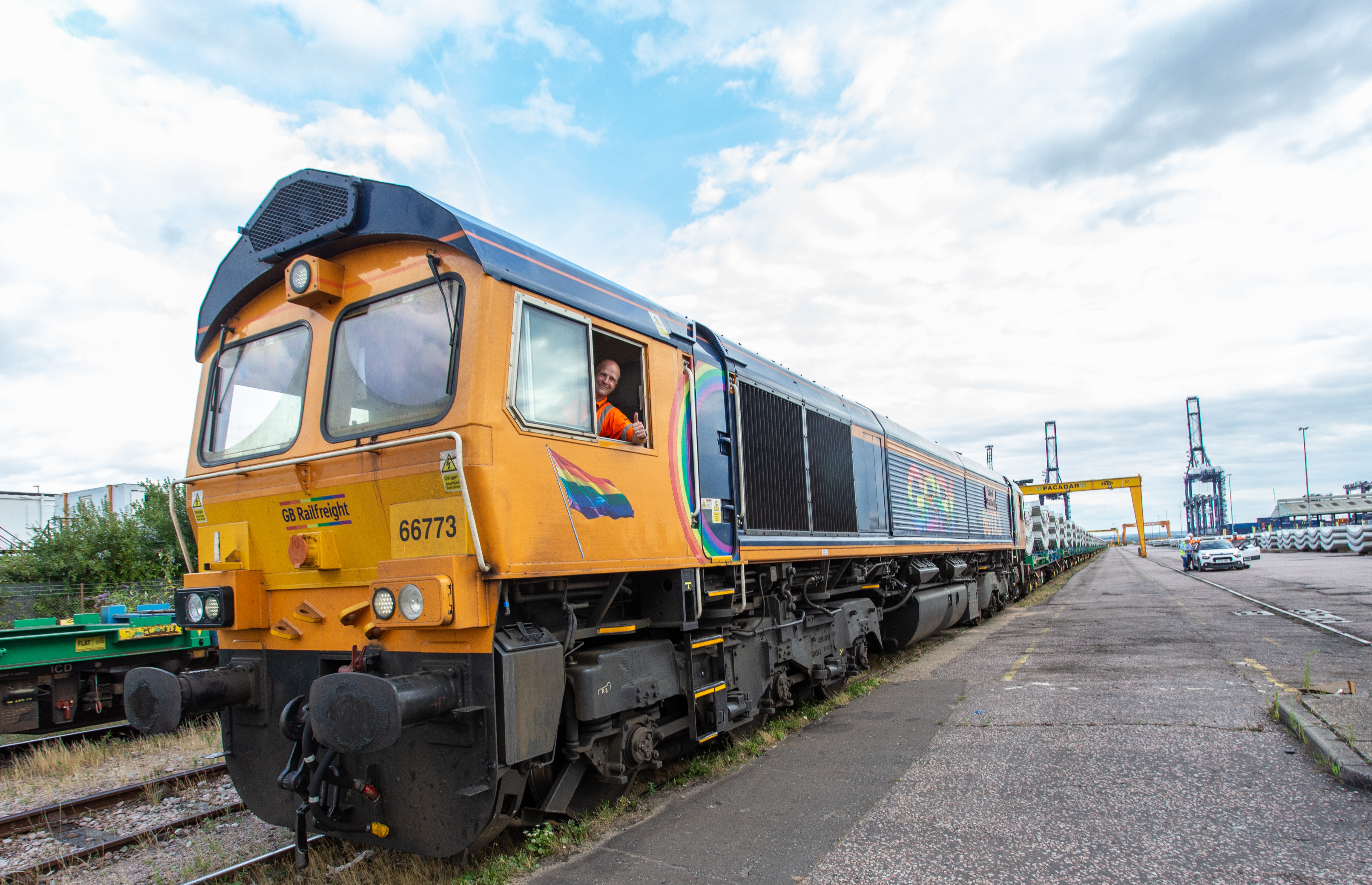 GBRf HS2 tunnel segment train - chris the driver gives the thumbs up