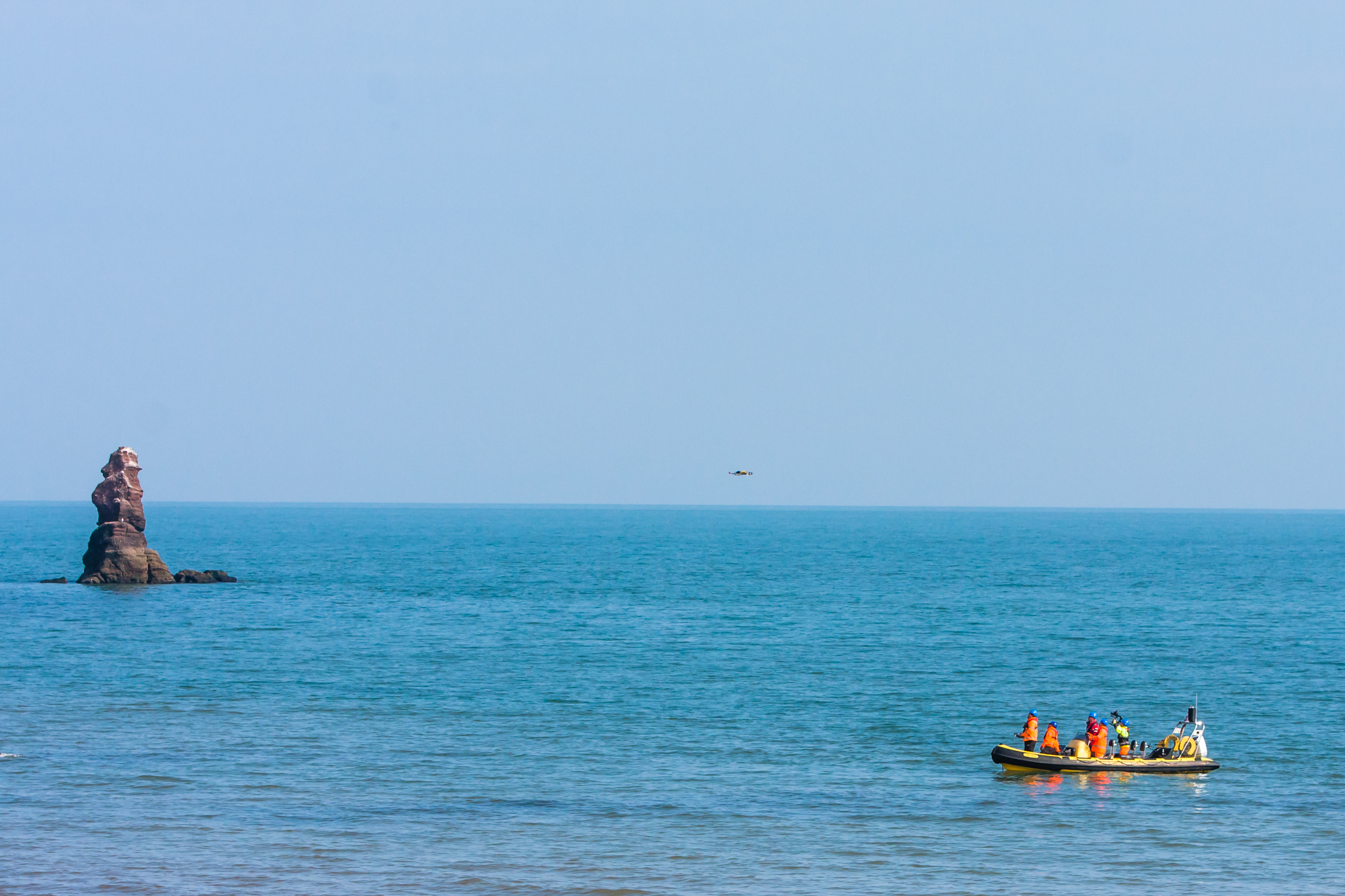 Crew in RIB with UAV 2: Unmanned Aerial Vehicle (UAV) being launched from a Rigid Inflatable Boat (RIB) at Teignmouth as part of a geological survey to improve the resilience of the railway between Exeter and Newton Abbot